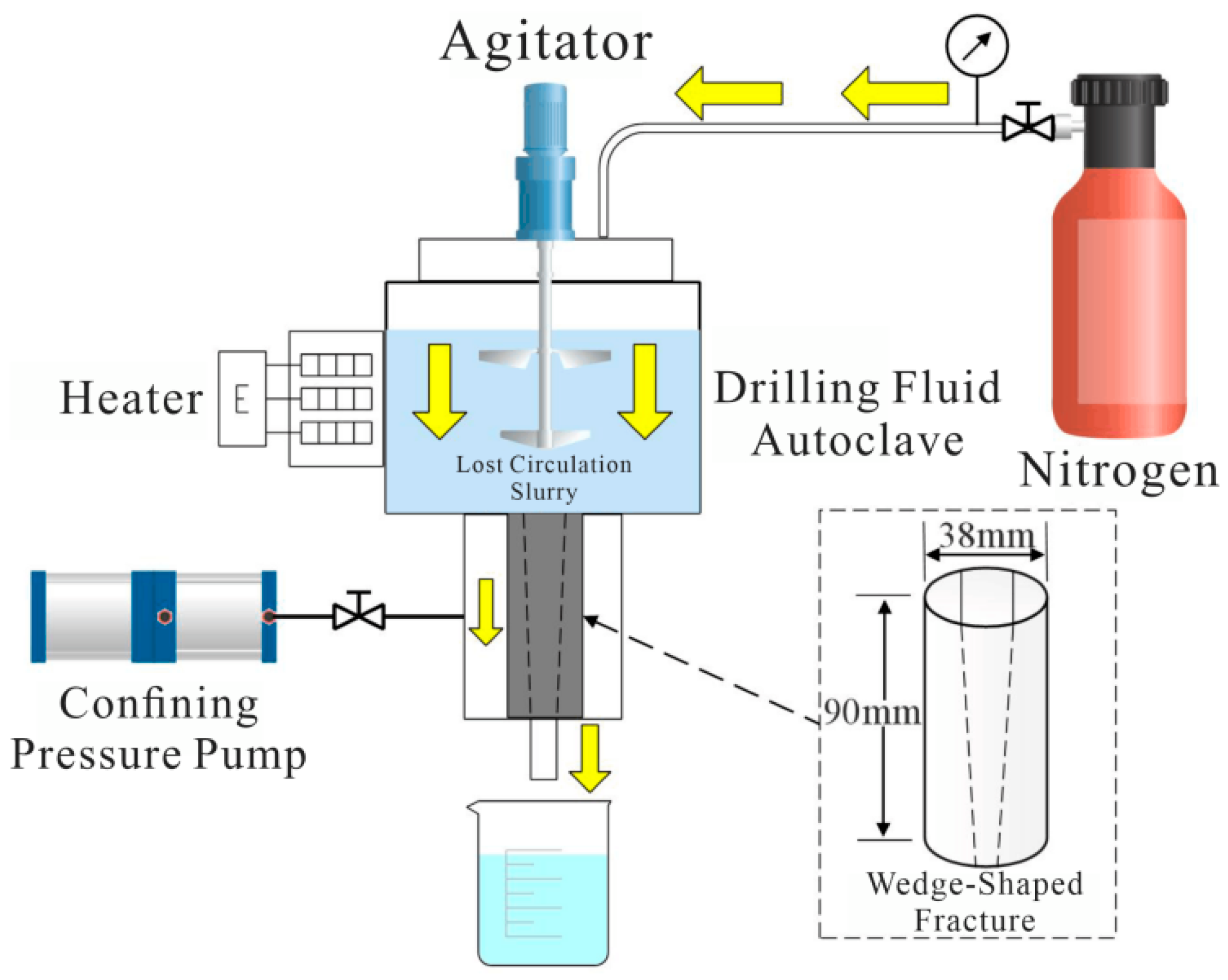 Plugging Performance Evaluation of the Pressure-Bearing Lost Circulation System: A high-temperature and high-pressure fracture-plugging experimental apparatus was employed to test the pressure-bearing capacity and leakage volume of the lost circulation formulations for different fracture widths, and to optimize the formulations. The prepared lost circulation working fluid was injected into an autoclave equipped with a fracture module of a specific width. At the set temperature (240 °C), a piston was driven at a constant rate to squeeze the lost circulation system into the fracture until the plugging layer failed and fluid breakthrough occurred. The maximum pressure before failure (i.e., the pressure-bearing capacity) and the leakage volume before breakthrough were recorded.