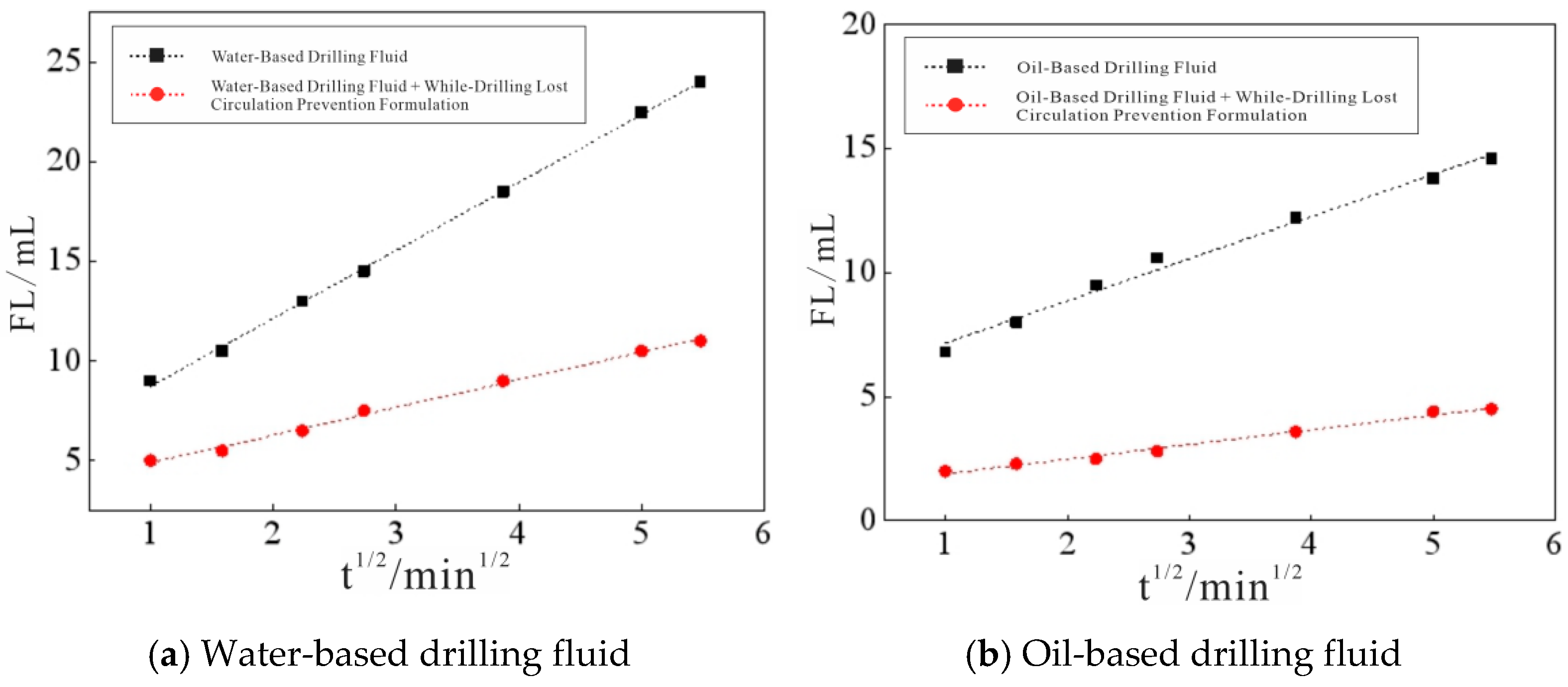 2, respectively. The total filtration loss, instantaneous filtration loss, and static filtration rate of oil-based drilling fluid also significantly decreased after adding the while-drilling leak prevention agent. Since the selected LCMs are all inert and compatible with both oil and water phases, the filtration loss of oil-based drilling fluids is lower than that of water-based drilling fluids. The primary differences may manifest in the dispersion stability of the materials, but this can be resolved by adjusting the wetting agents and emulsifiers in the oil-based drilling fluid.