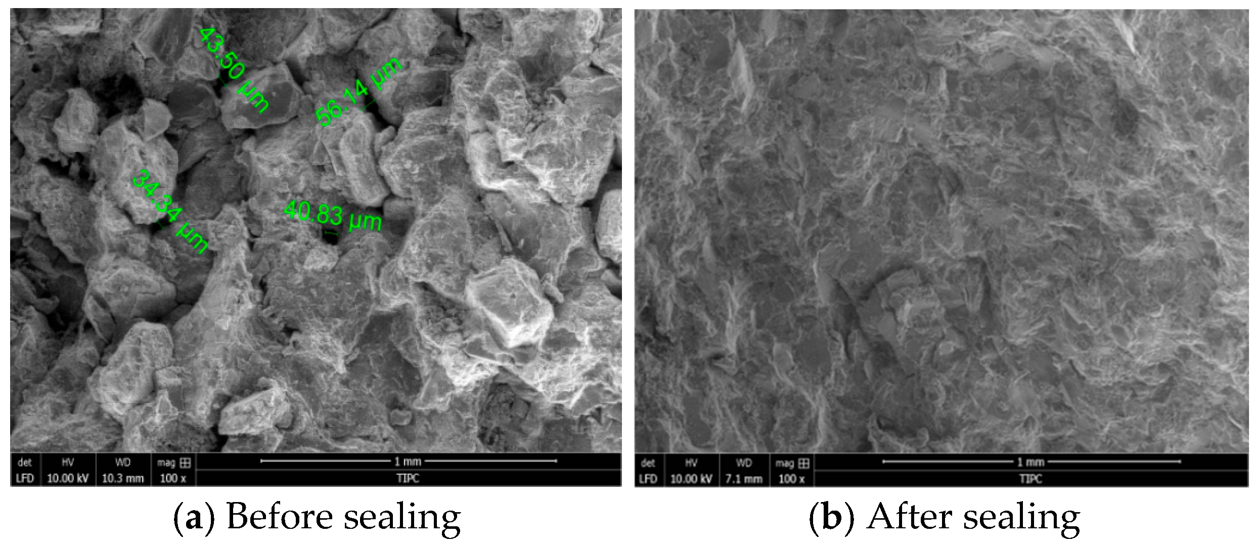 Figure 10 shows SEM images of the water-based drilling fluid before and after sealing the sand disk. The unsealed sand disk exhibited numerous micropores, while the sealed structure became dense with effective plugging performance.