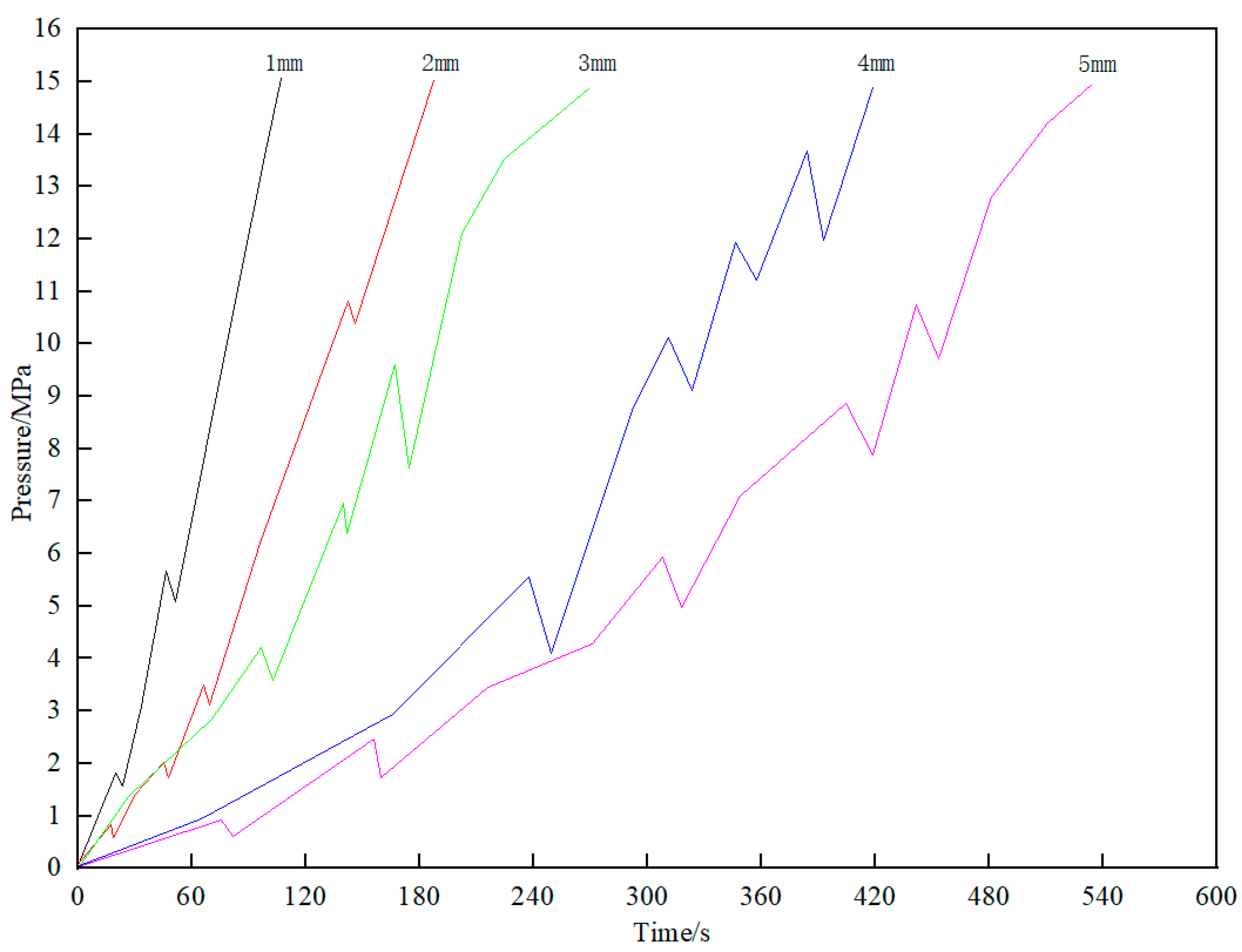 Figure 11. The pressure remained stable at 15 MPa for 10 min without breakthrough, indicating a pressure-bearing capacity of 15 MPa. Moreover, as the fracture aperture increased, the plugging time extended, requiring more materials to enter the fracture to achieve the high pressure-bearing performance.