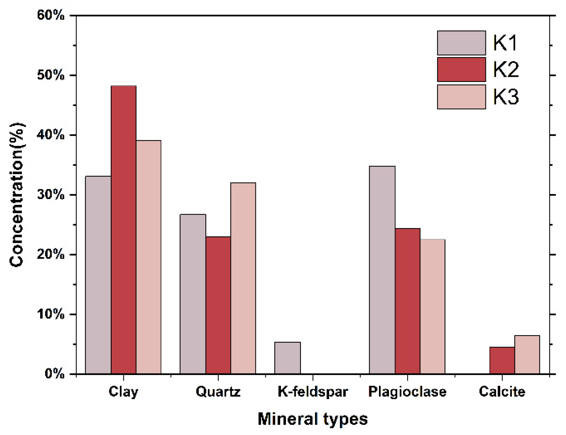 | Clay Minerals | Barite | Quartz | K-Feldspar | Plagioclase | Calcite | Dolomite | Siderite | Pyrite | ||