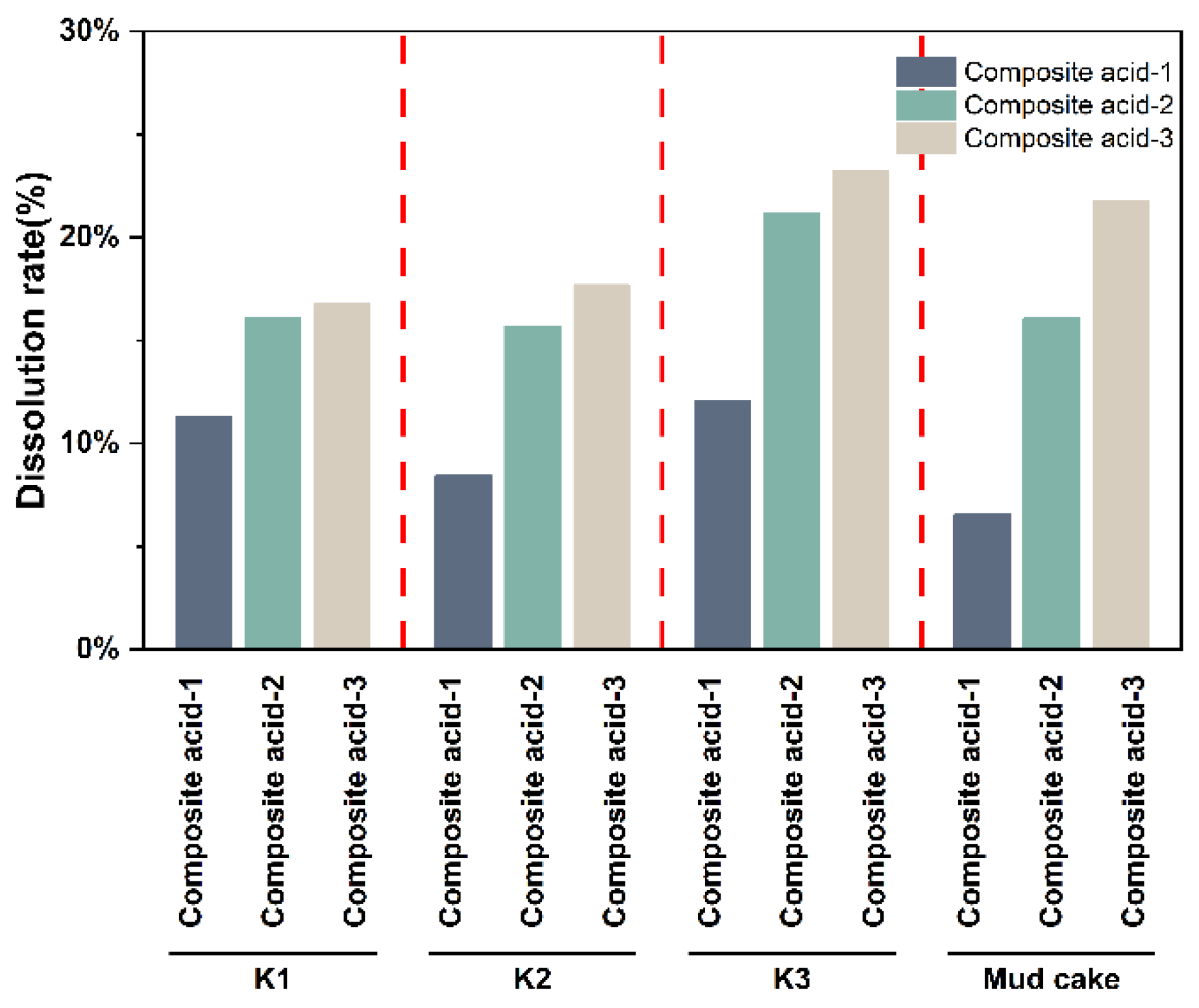 - Optimized Composite Acid Design: An optimized high-compatibility composite acid system was developed by integrating HCl, fluorine-containing acids, and polyprotic acid with corrosion inhibition, iron control, clay stabilization, and diversion additives. The formulation is specifically designed for damage removal in sandstone gas storage reservoirs.