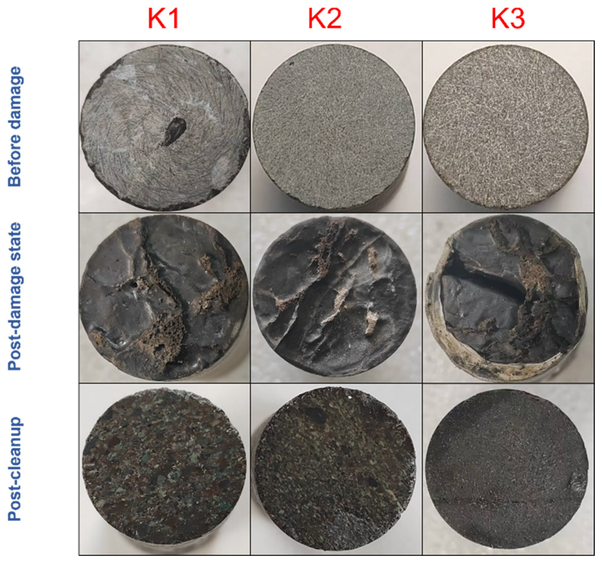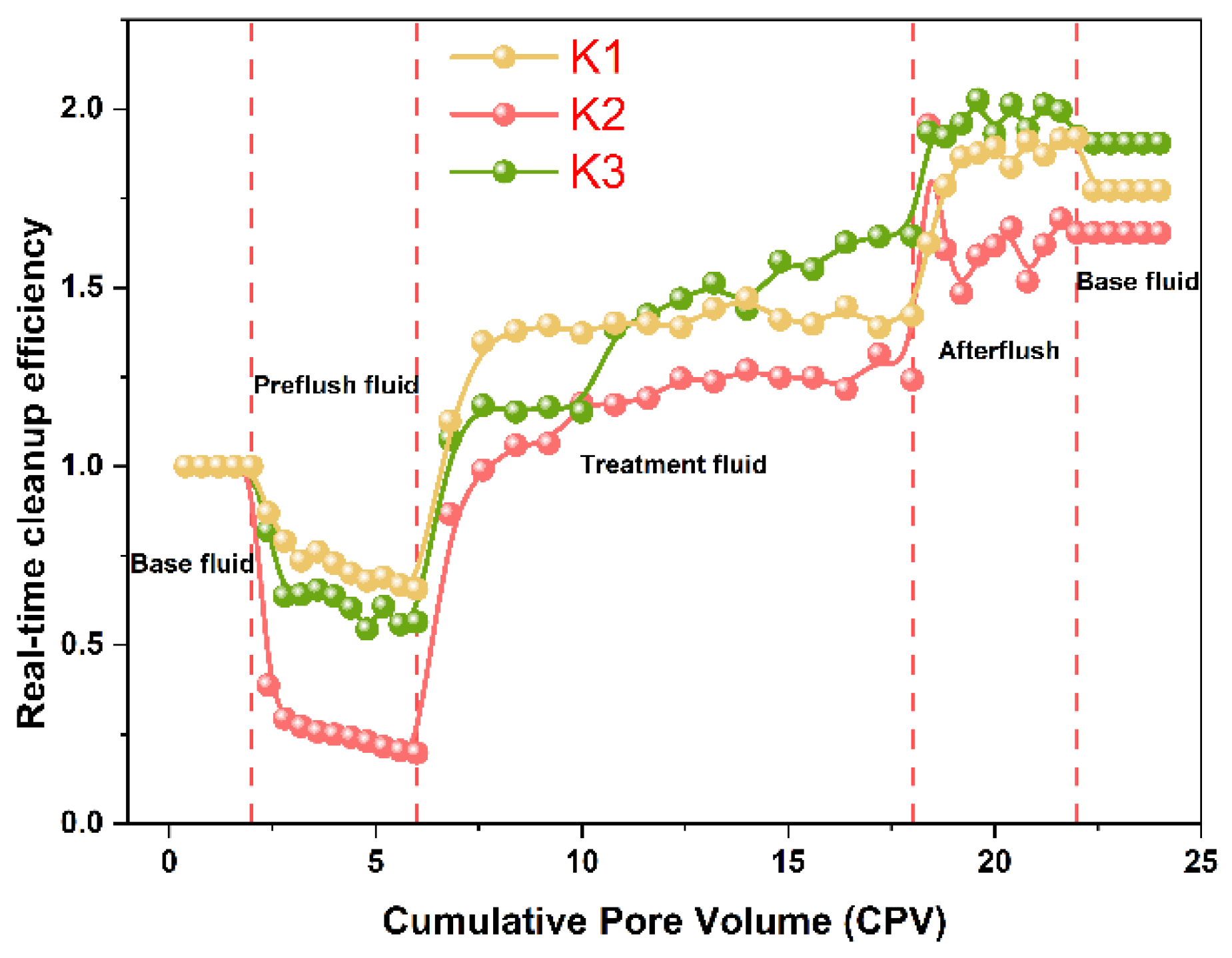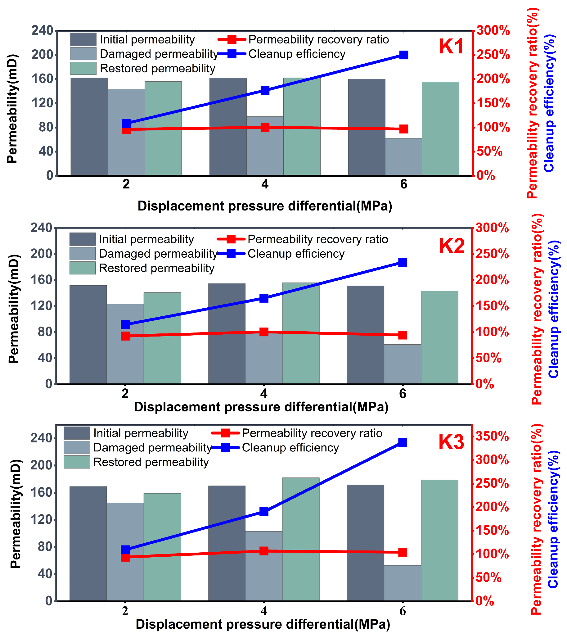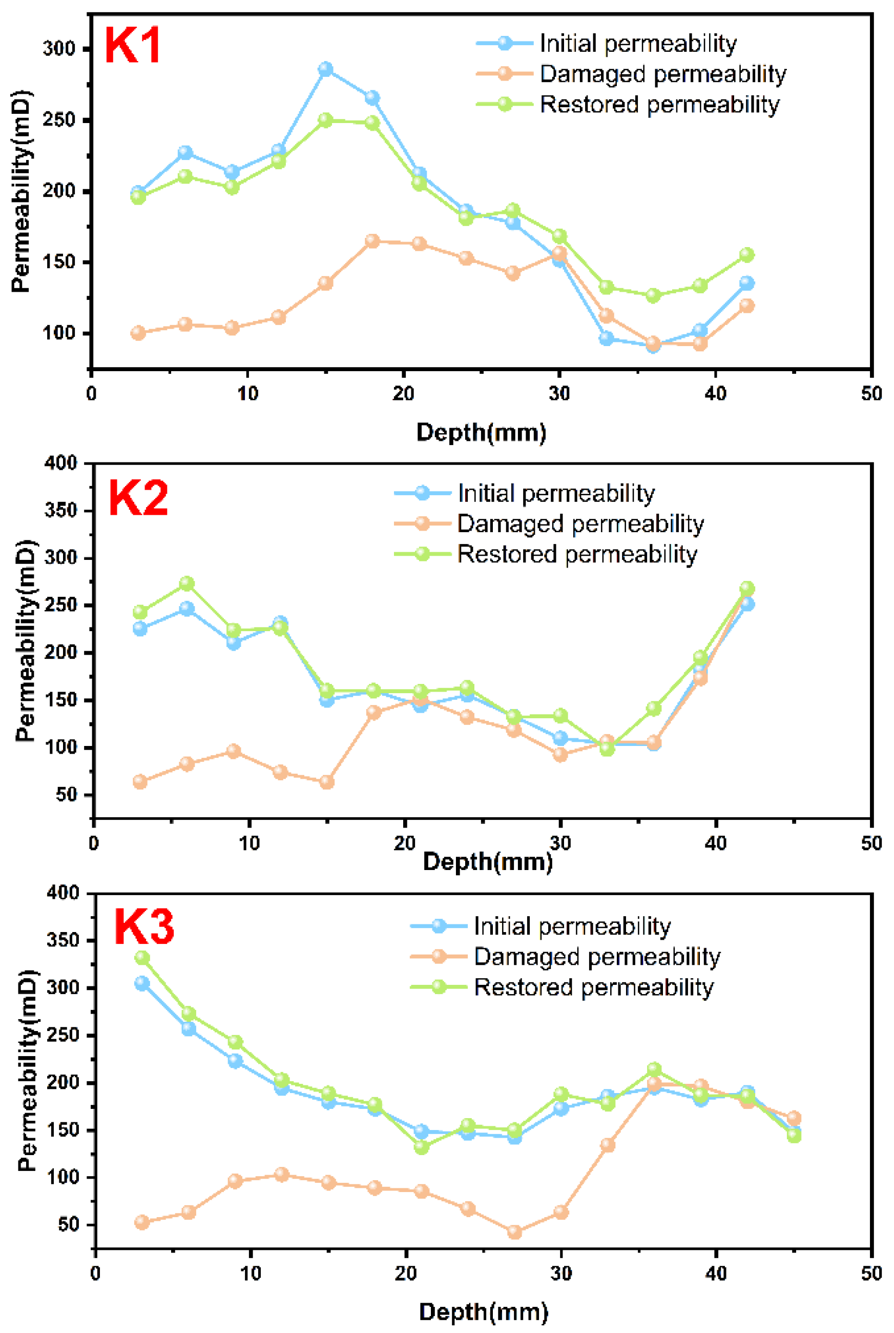 - Effective Damage Removal and Permeability Restoration: Core-scale flow-through experiments confirm that the composite acid efficiently removes drilling-fluid-induced formation damage without causing core-face erosion or framework degradation. Permeability is effectively restored and locally enhanced, indicating reconnection of blocked pore–throat pathways rather than excessive matrix dissolution.