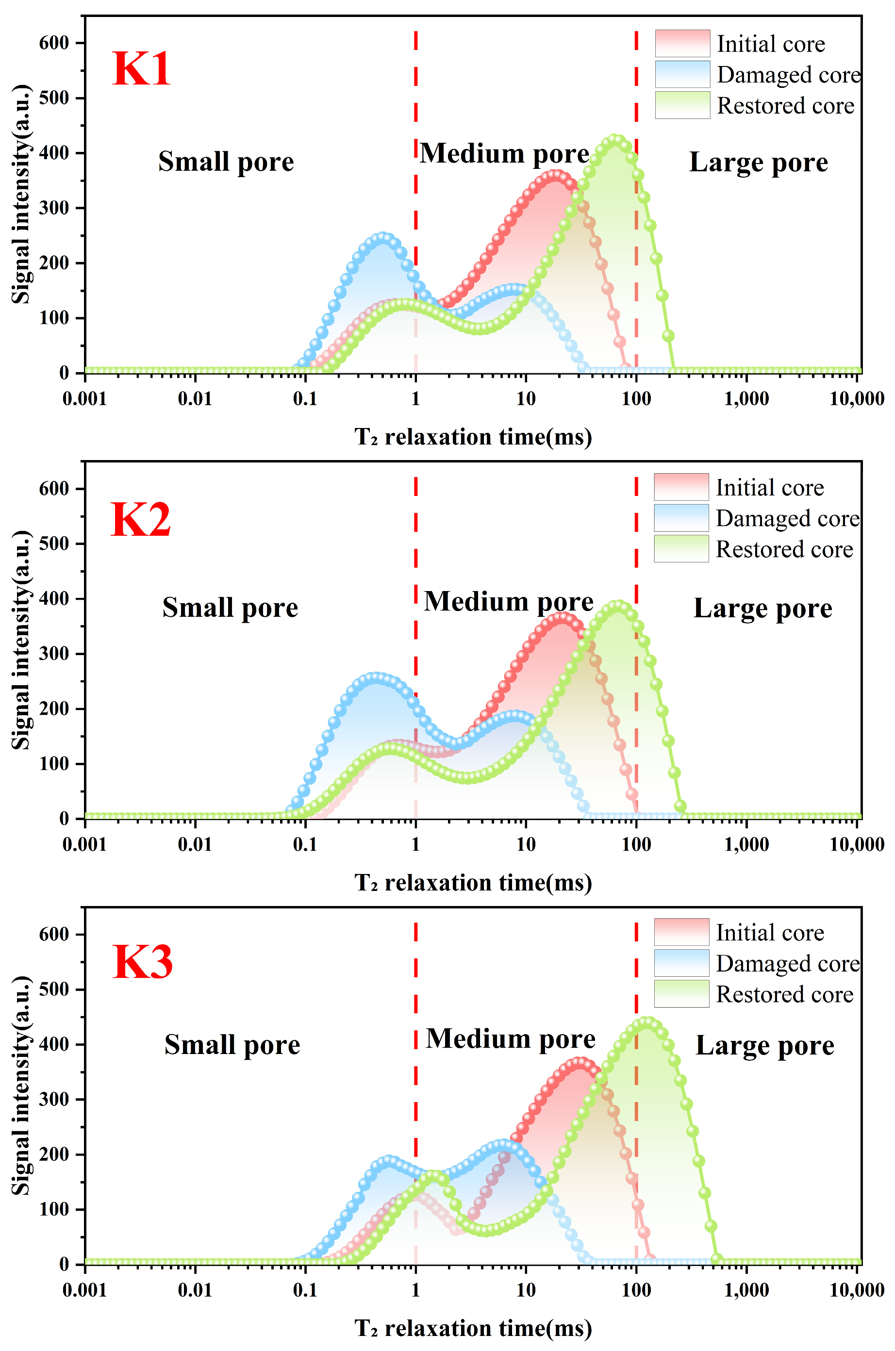 - Li, W.; Qiu, Z.; Liu, C.; Wang, Y. Real-time NMR investigation of water infiltration mechanisms and pore structure evolution in fractured sandstone near-wellbore regions. Pet. Sci. 2025, 22, 4195–4210. [Google Scholar] [CrossRef]