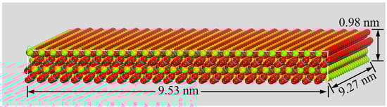 For the water wetting simulations, a larger substrate was created by expanding the optimized (104) surface model into a 4-layer supercell with in-plane dimensions of 18 × 21 unit cells. This yielded a superlattice surface measuring approximately 9.53 × 9.27 × 0.98 nm3 (Figure 3). Subsequently, a spherical water droplet containing 1000 molecules (approximate diameter: 2.0 nm) was constructed using the Amorphous Cell module. This droplet was then placed on the mineral surface substrate using a layer addition method to create the initial wetting model. A vacuum layer of 6.0 nm was retained above the droplet. All MD simulations employed the COMPASS II force field, which has been validated for modeling condensed-phase materials, minerals, and interfacial systems. Non-bonded interactions (van der Waals and electrostatic) were calculated using an atom-based summation method. A cutoff distance of 1.25 nm was applied to van der Waals interactions. Electrostatic interactions were treated using the Ewald summation method with an accuracy of 1.0 × 10−5 kJ/mol [7,15]. Following energy minimization, production MD simulations were performed in the NVT (canonical) ensemble at 298 K, using a Nosé–Hoover method with a coupling constant of 0.1 ps. The equations of motion were integrated using the Velocity Verlet algorithm with a time step of 1.0 fs. Each wetting simulation had a total duration of 500 ps. The first 100 ps were allocated for system equilibration, confirmed by monitoring the stabilization of total energy and droplet conformation. Trajectory data for analysis, including contact angle calculation, were collected from the subsequent 400 ps production run. To ensure statistical reliability and account for stochastic variations in initial droplet placement, three independent simulation trials were conducted.