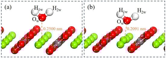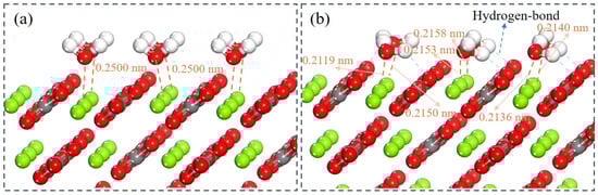 DFT simulations of a single water molecule adsorbed on the magnesite (104) surface were performed to elucidate the fundamental interaction mechanisms. This approach reveals key factors governing wettability and reactivity through calculations of adsorption energy, electron density distribution, and bonding characteristics, thereby establishing a theoretical basis for surface property regulation [28]. To examine the evolution of the hydration layer, water molecules were incrementally added to construct successive monolayers. Following the establishment of the first monolayer, subsequent layers were added to study interlayer connectivity, with the entire system re-optimized at each stage. This methodology allows for the examination of how the surface influence diminishes with increasing hydration layer thickness. Figure 5 illustrates the optimized configuration of a single water molecule before and after adsorption on the magnesite (104) surface. In the initial state (Figure 5a), the water oxygen atom (Ow) was positioned 0.2500 nm from the outermost surface Mg atom. After adsorption (Figure 5b), the Ow atom approaches the Mg atom, resulting in an Mg–Ow bond distance of 0.2091 nm. This distance is slightly less than the sum of the atomic radii of O and Mg (0.2100 nm) [29], suggesting covalent bond formation. The calculated adsorption energy of −91.6 kJ/mol for a single water molecule at the Mg site confirms a thermodynamically favorable and spontaneous process. This strongly negative value significantly exceeds the typical threshold for physisorption (approximately −40 kJ/mol), confirming strong chemisorption involving substantial charge transfer and the formation of a coordinative Mg–Ow bond [43]. Notably, this adsorption energy is more negative than values reported for water on the dolomite (104) surface (ranging from −65 to −80 kJ/mol) [44,45], highlighting a stronger water affinity for the magnesite surface. This energetic discrepancy provides a molecular-scale explanation for the distinct interfacial hydration and flotation responses observed between magnesite and dolomite [43]. These findings provide a molecular-level rationale for flotation strategies, suggesting that effective polar collectors must compete with this strongly bound hydration layer.