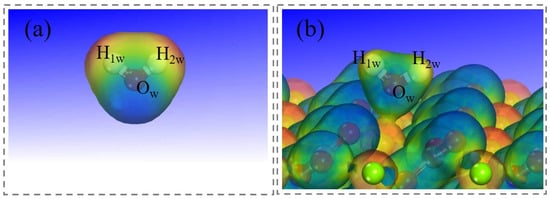 Electrostatic potential distribution diagram. (a) An individual water molecule. (b) The single water molecule adsorbed on magnesite.