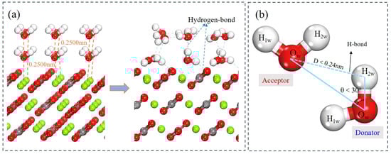 Furthermore, analysis of the z-axis displacements of atoms within the water layers provides insight into the evolving interaction strength between magnesite and successive water layers [56,57]. Hydrogen bonding is a key indicator for analyzing both water–water and water–magnesite interactions. A hydrogen bond was identified using geometric criteria: an O···H distance < 0.2400 nm and an O–H···O angle > 150° (equivalent to a donor angle < 30°) (Figure 12b) [58]. As detailed in Table 8, surface Mg atoms exhibit an outward relaxation (toward the aqueous phase) upon hydration. The magnitude of this displacement is greatest for the bilayer and attenuates with the addition of the third layer. This indicates that the structural rearrangement of the magnesite surface is most sensitive to the first few hydration layers. The Ow atoms of the first monolayer undergo inward relaxation. In contrast, the oxygen atoms of outer water molecules display outward relaxation, driven by hydrogen bonding with the layer beneath. Consequently, while Ow atoms in the second layer form H-bonds with the first layer, the effective bonding force per molecule weakens in the third layer, leading to a reduced average outward displacement.