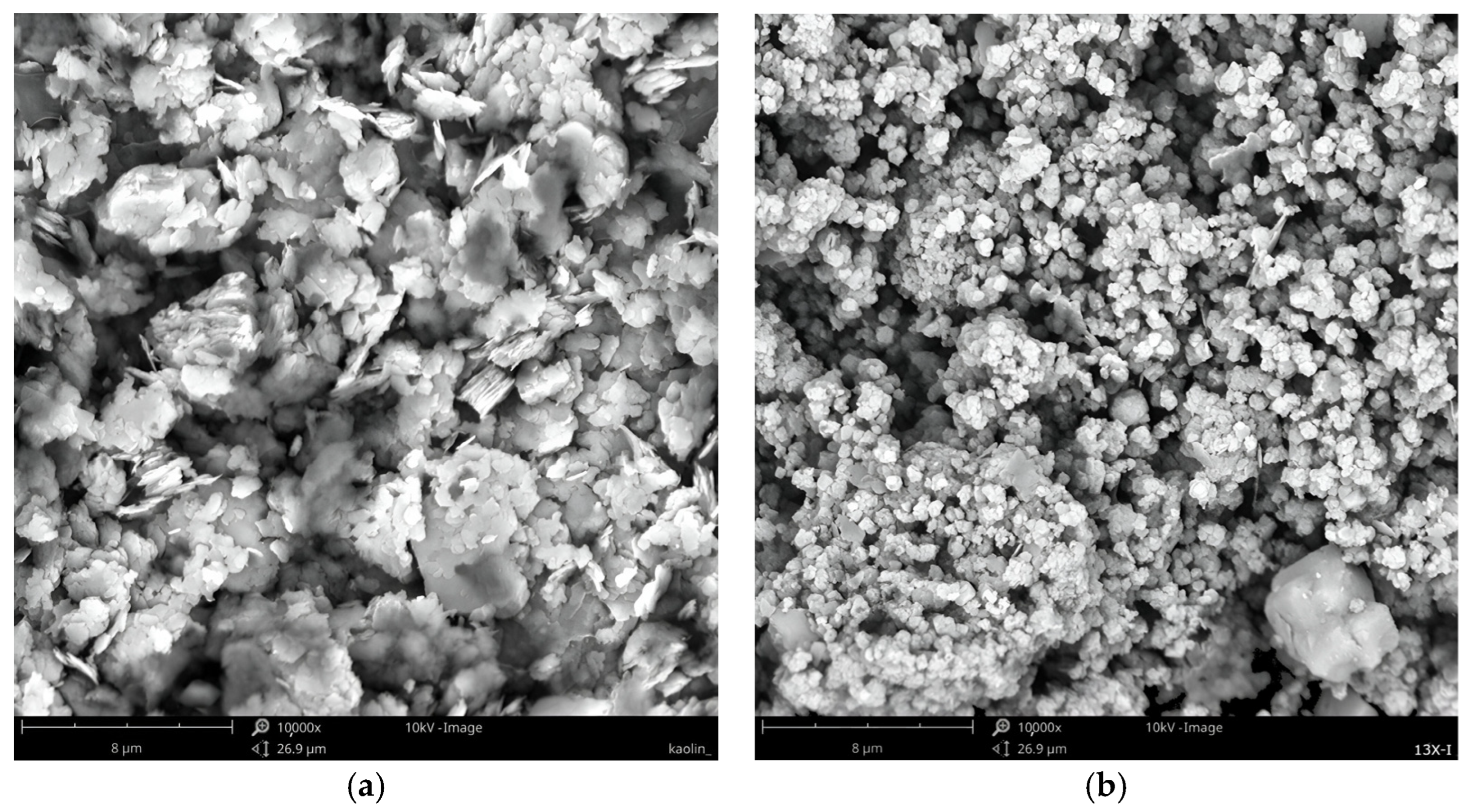 - De Lucas, A.; Uguina, A.M.; Covián, I.; Rodríguez, L. Synthesis of 13X Zeolite from Calcined Kaolins and Sodium Silicate for Use in Detergents. Ind. Eng. Chem. Res. 1992, 31, 2134–2140. [Google Scholar] [CrossRef]