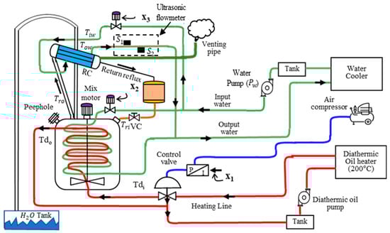 The RC acts as a cooling device, condensing reflux material and returning it to the reactor at 40–50 °C, as shown in green pipe in Figure 4. Using previous criteria, the phase can be expressed as a function involving activation energy , on the Arrhenius law, in addition to the cooling flow , and water temperature differences in RC.