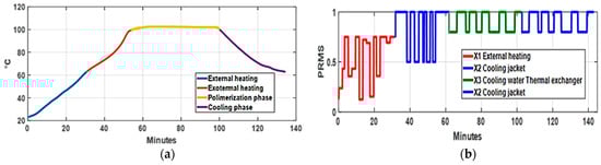 Reactor temperature and process PRMS signals: (a) reactor temperature: the blue indicates external heating, the red represents exothermic heating, the orange signifies the exothermic polymerization phase, and the violet shows the cooling phase; (b) PRMS signals the activation of the system valves across all phases of resin manufacturing.