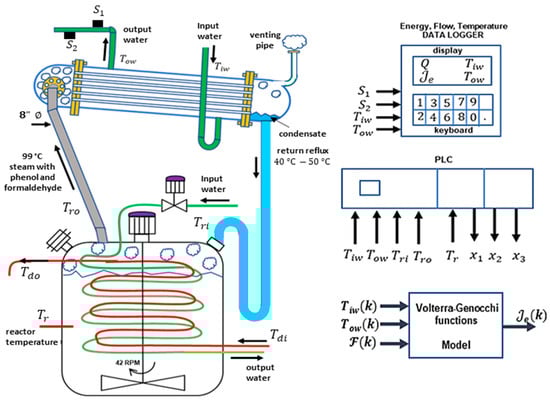 As a crucial step in the heat exchanger modeling process, data from tests of the entire reactor system are collected, as shown in Figure 4. These tests focus on the thermal behavior of the CR in the industrial reactor, validate the model, and highlight its importance in developing processes with exothermic reactions. In this context, Figure 4 displays the use of ultrasonic flow meters and Pt100 sensors, which enable real-time monitoring of the flow rate , temperature differences , and energy profiles for producing a batch of resole-type phenolic resin.