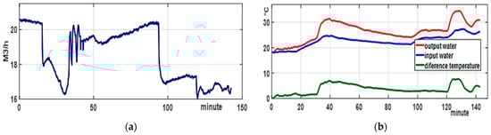As explained, the RC model is built using Volterra–Genocchi functions along with the main variables in an RC, such as the water flow rate shown in Figure 5a, which is used to cool the exchanger; also, the increase in water temperature during the process cycle, as depicted in Figure 5b, and it is described in Equation (20).