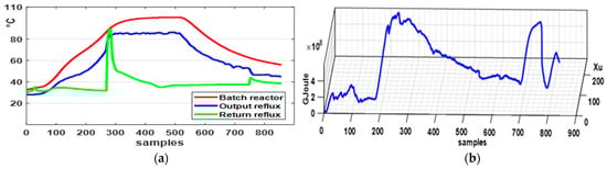 The behavior of an RC used in manufacturing phenolic resins must be modeled based on changes in reactant temperature. Such changes are shown in Figure 3a; the blue line indicates the external heating phase, which ends at 65–67 °C, while the red line represents the self-heating phase, which concludes at 100–102 °C. At this point, the yellow line shows that phenol and formaldehyde begin to polymerize. The excess water boils off, and vapor containing phenol and formaldehyde is pushed into the RC. To achieve the temperature changes of the reagents, the PRMS signals shown in Figure 3b were used.