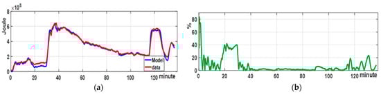 Figure 10a shows the energy evolution in the reflux condenser (red line), manufacturing phenolic resin, compared to the experimental Volterra–Genocchi model (blue line). The model of thermal energy (Equation (36)) matches the flow rate measurements, cooling water temperature differences, and the values of the on (Table 3), which assign weights to the polynomials representing the Volterra kernels.
