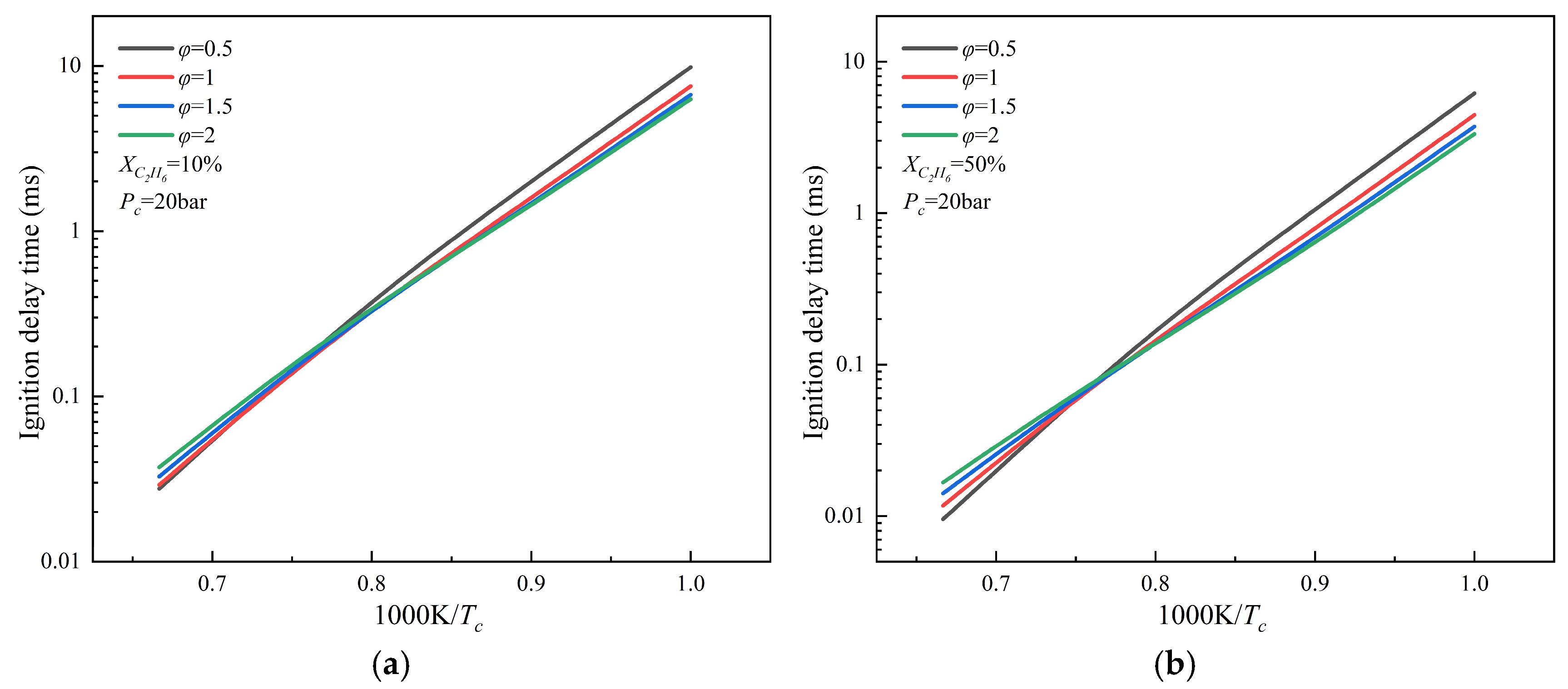 - Under representative conditions (Pc = 10, 20 bar, φ = 1.0, and XCH ≥ 30%), the ignition delay times of NH3/C2–C4 alkane mixtures exhibit similar trends and are consistently shorter than those of the NH3/CH4 mixture. At low initial temperatures, the ignition delay time decreases in the following order: NH3/CH4 > NH3/C2H6 > NH3/C3H8 > NH3/C4H10. In contrast, under high temperature conditions, the ignition delay time follows the order NH3/CH4 > NH3/C3H8 > NH3/C4H10 > NH3/C2H6. These results indicate that, at low temperatures, ignition performance improves progressively with increasing carbon chain length of the blended alkane. In addition, variations in equivalence ratio exert only a minor influence on ignition delay time compared with temperature and fuel composition effects.