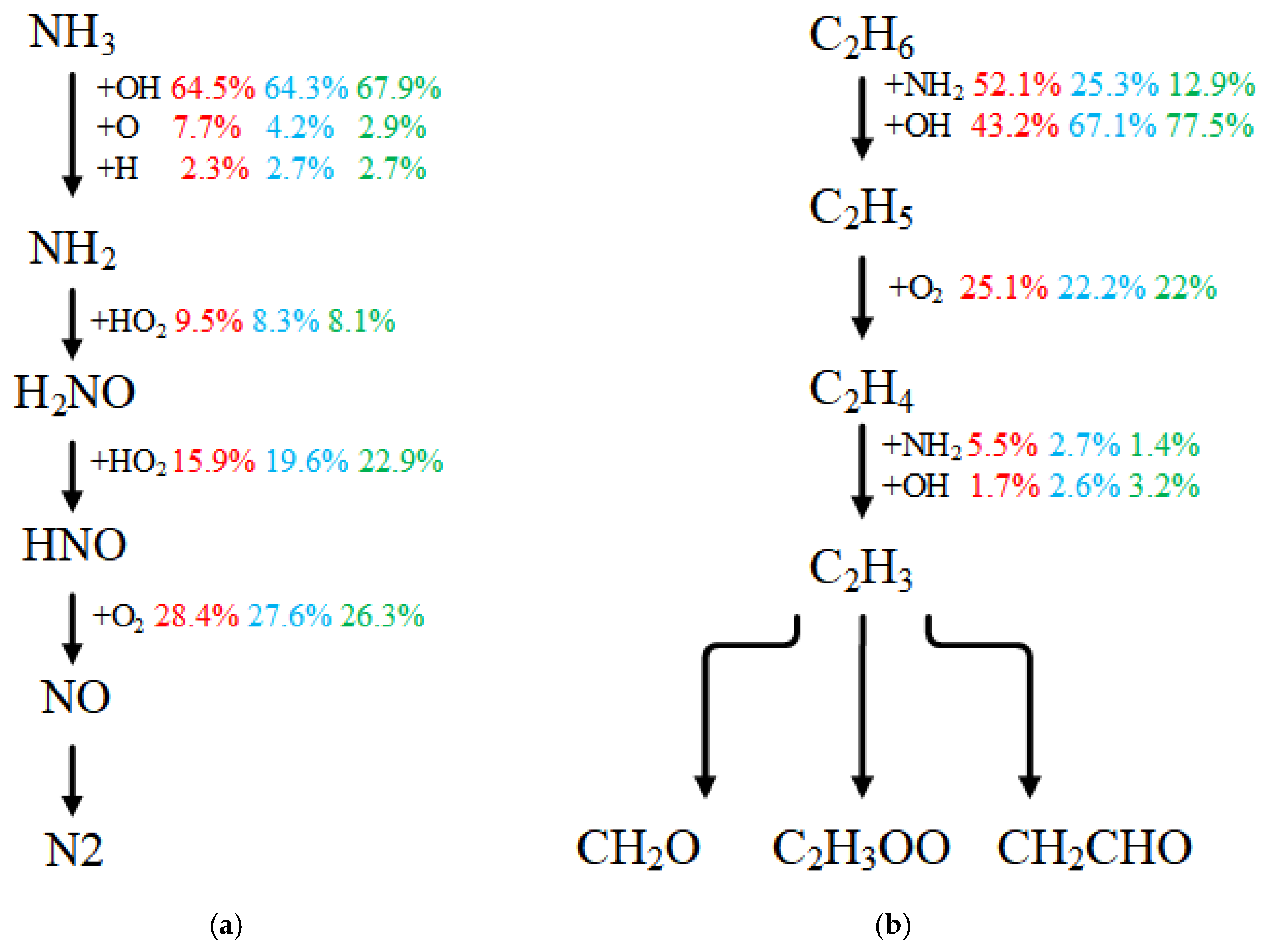 - Liu, J.; Liu, D.; Dai, L.; Zou, C.; Lin, Q. The effects of C/N cross-reactions on the NH3/C3H8 combustion: A shock-tube and modeling study. Combust. Flame 2024, 270, 113716. [Google Scholar] [CrossRef]