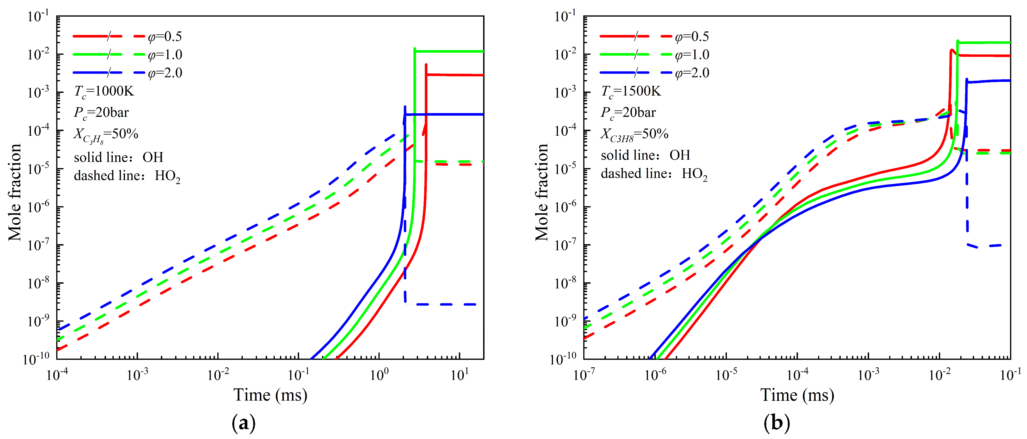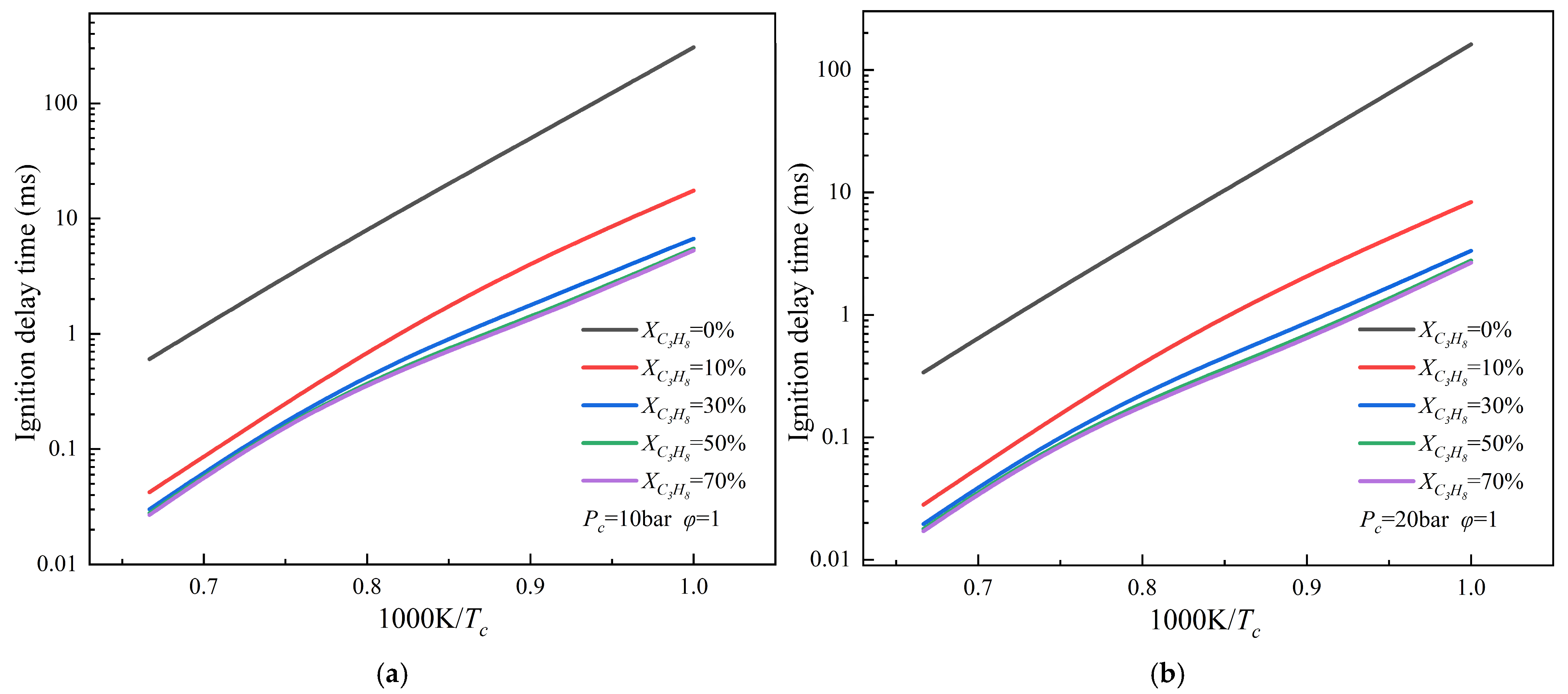 3.3. Study of the Ignition Characteristics of NH3/C3H8 Mixtures