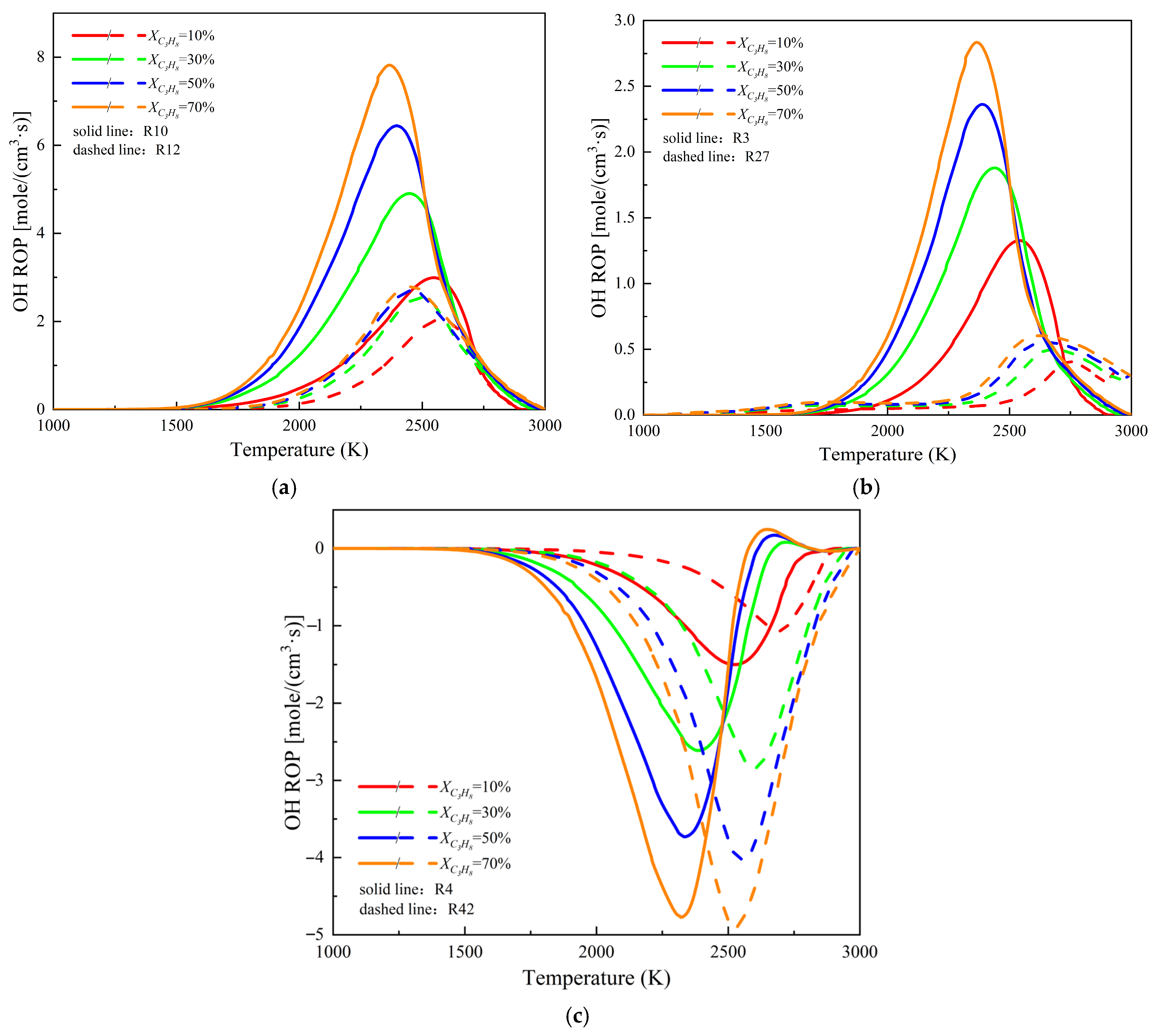 3.2. Study on the Ignition Characteristics of NH3/C2H6 Mixtures