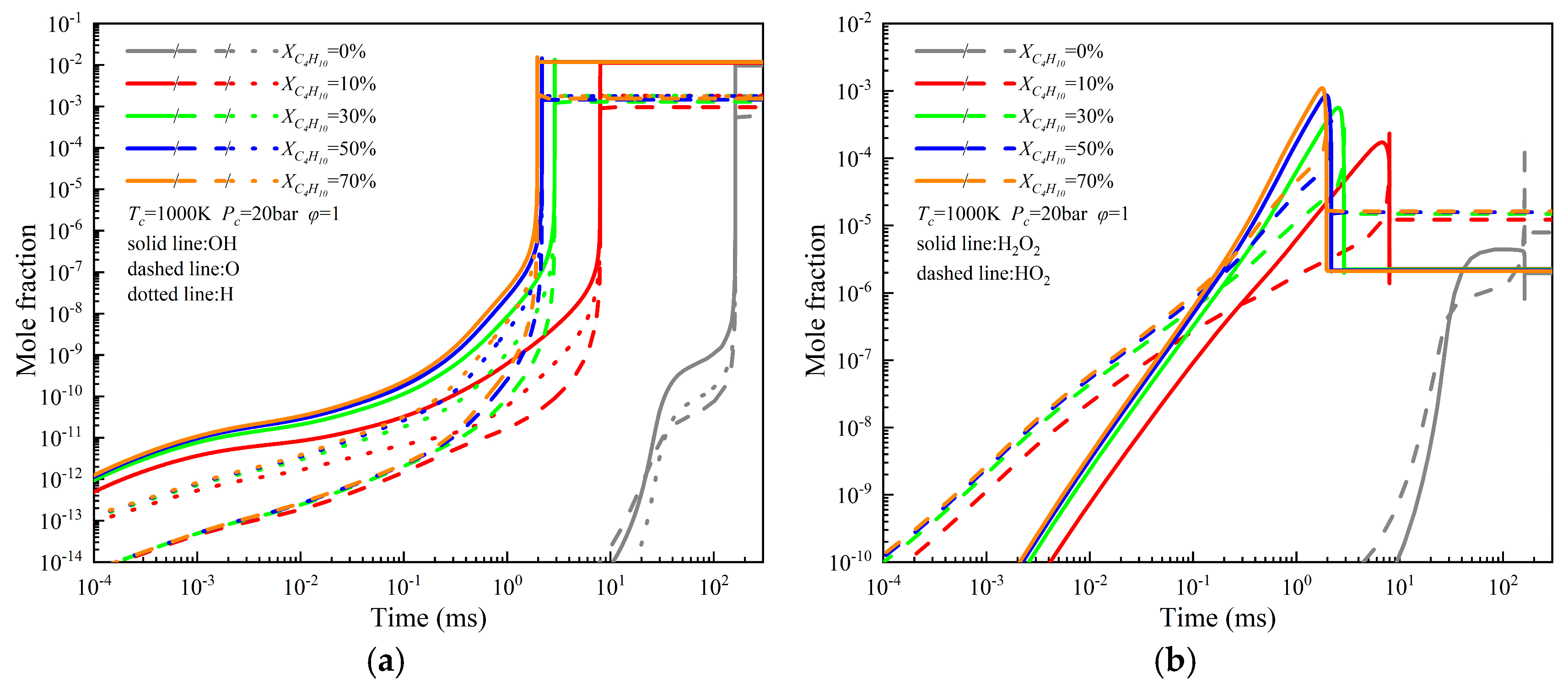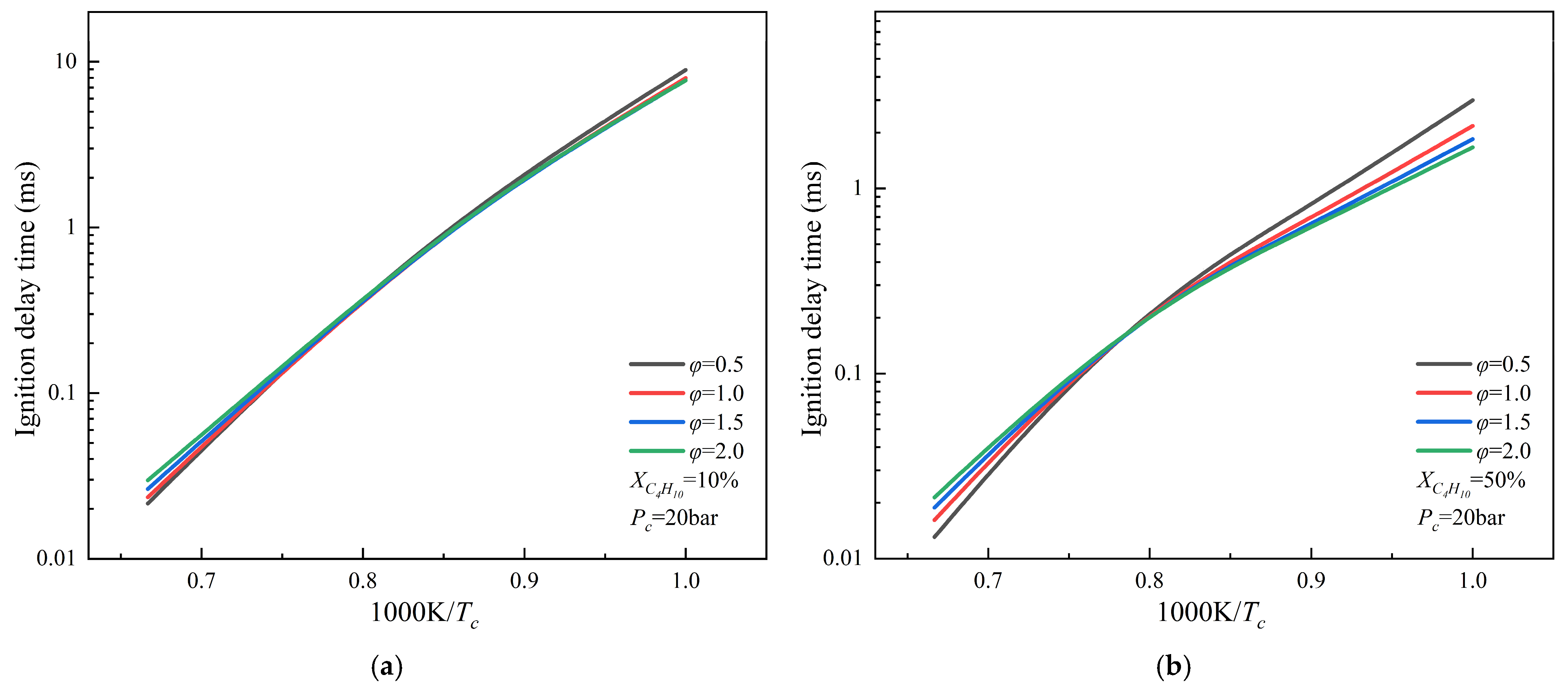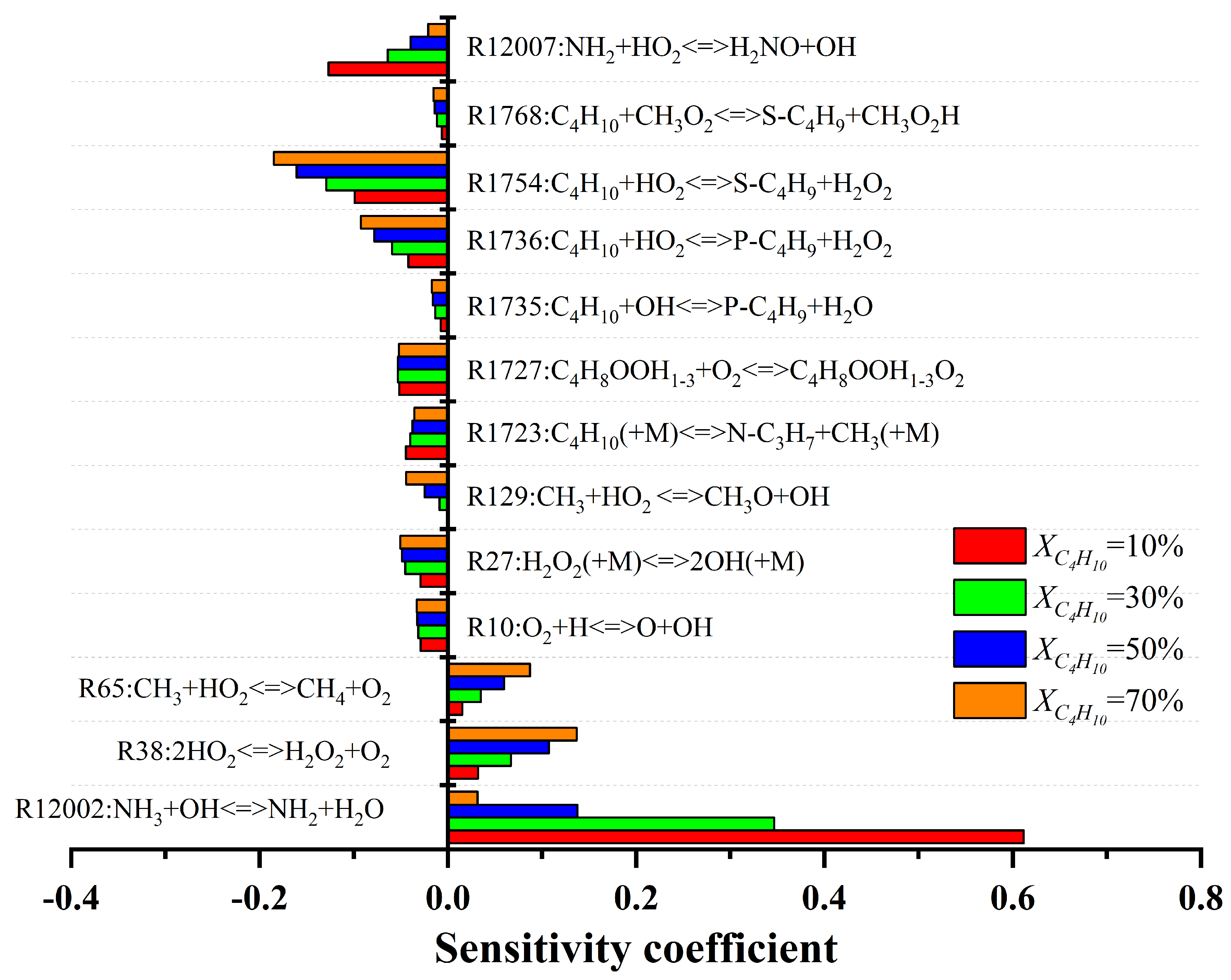 3.4. Study of the Ignition Characteristics of NH3/C4H10 Mixtures