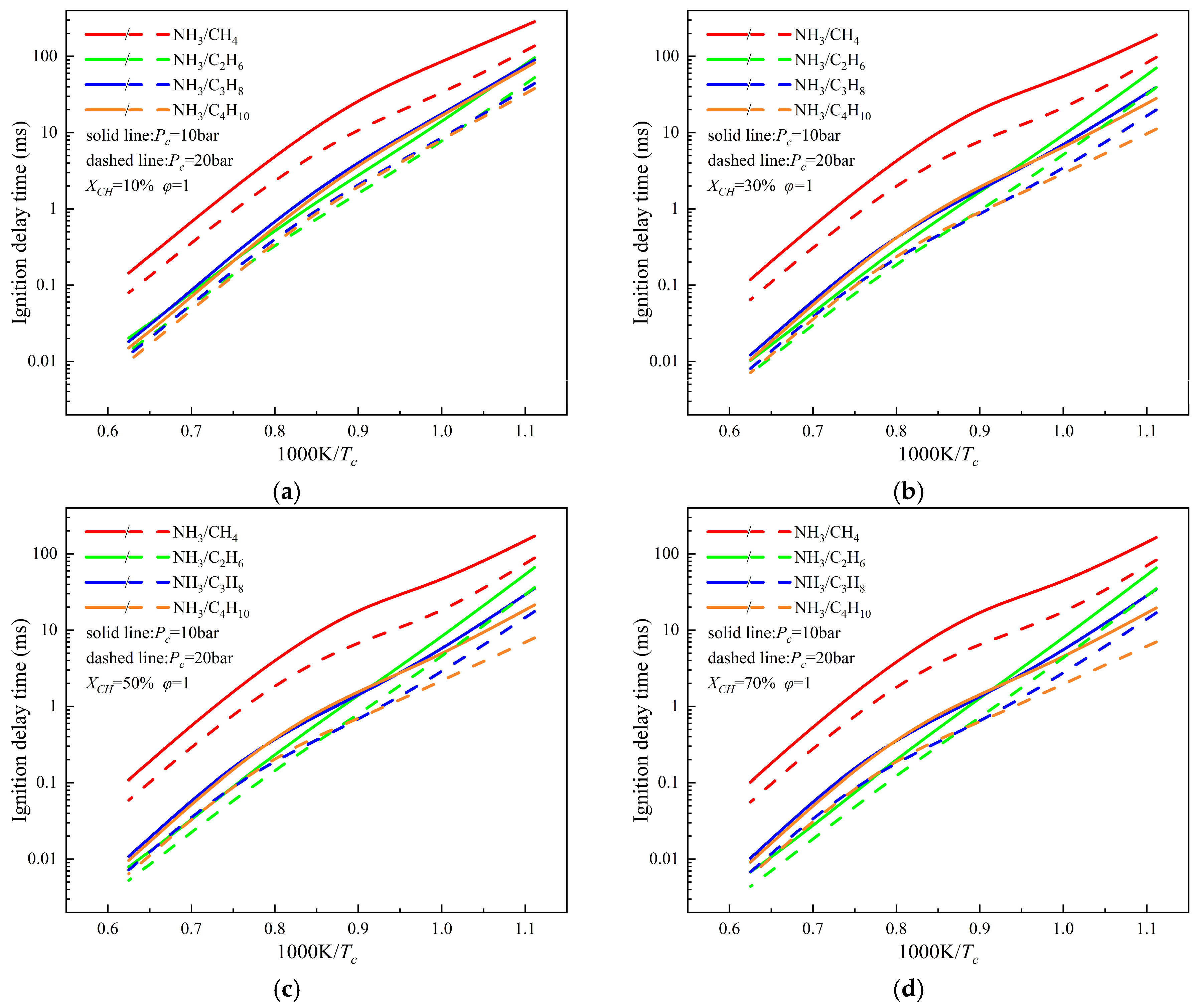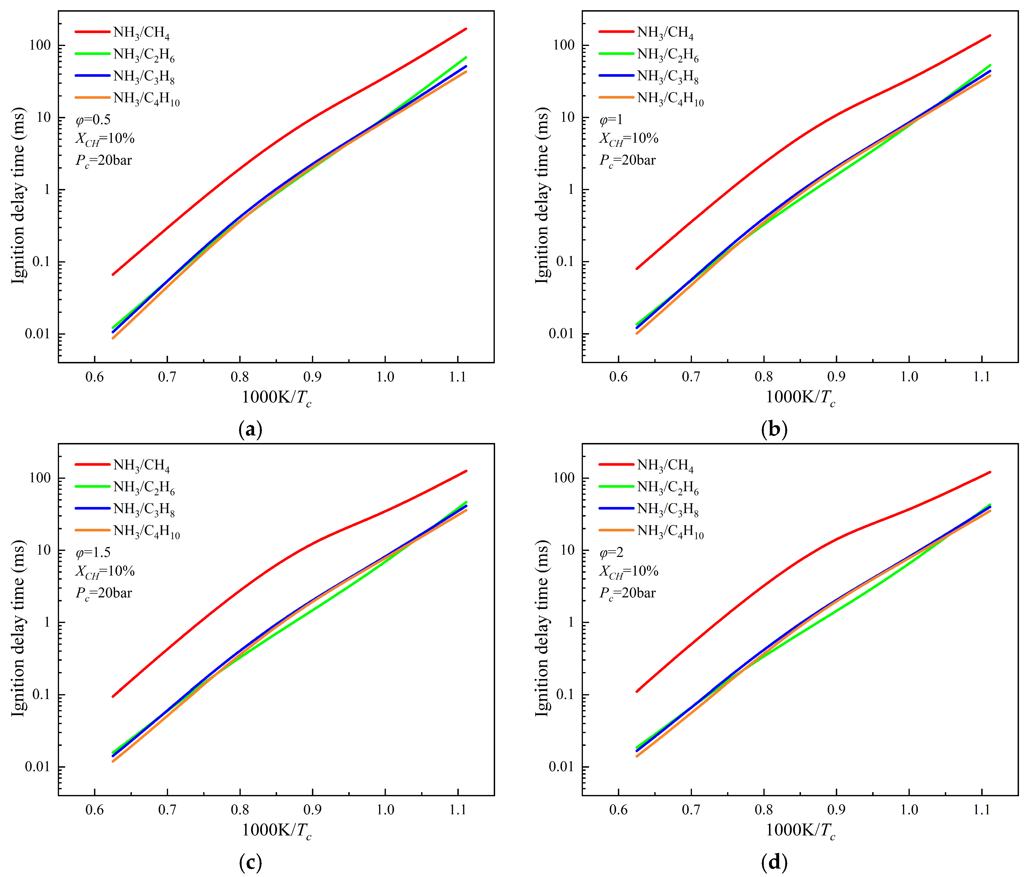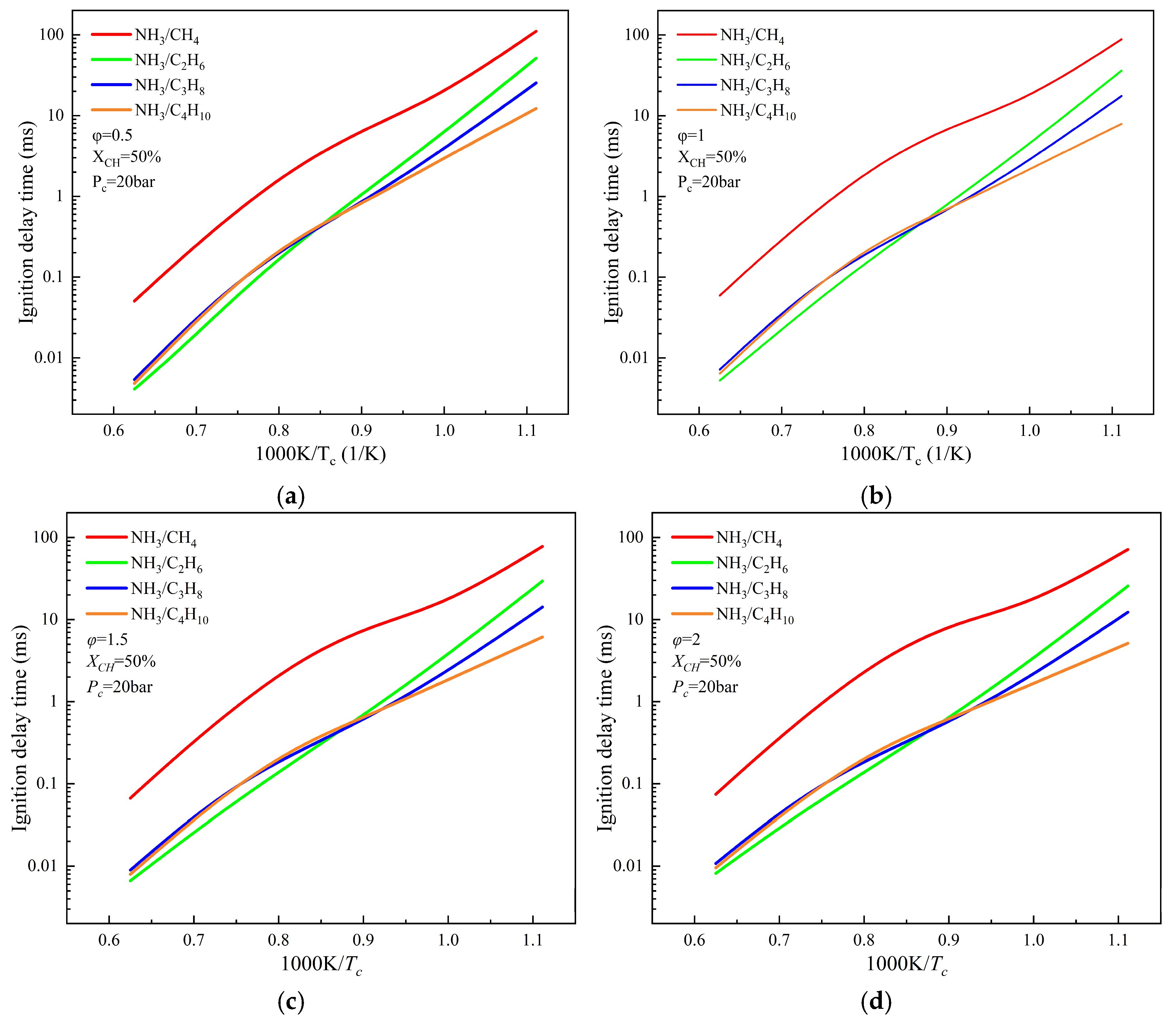 3.5. Comparison of Ignition Characteristics of NH3/C1–C4 Alkane Mixtures