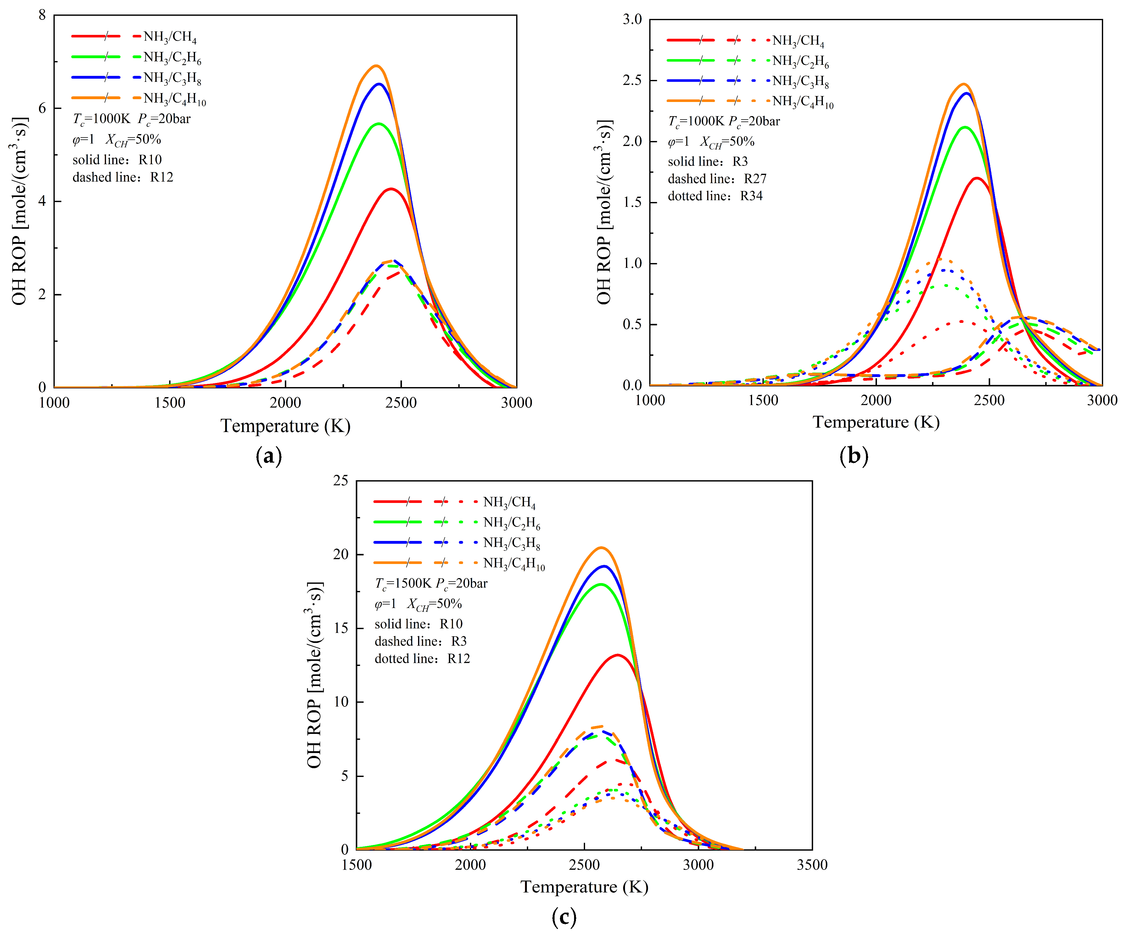 - Temperature-dependent reaction pathway characteristics of NH3: Reaction pathway analysis reveals that at lower initial temperatures, NH3 dehydrogenation is dominated by reactions involving OH radicals. As the carbon number of the blended alkane increases, the contribution of OH to NH3 dehydrogenation increases, while the involvement of NH2 radicals in alkane dehydrogenation decreases, resulting in an enhanced forward reaction rate in the initial dehydrogenation step. At higher initial temperatures, a larger fraction of NH3 participates in NO reduction reactions, which reduces the proportion of NH3 involved in dehydrogenation pathways.