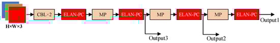 By replacing the original ELAN module in the YOLOv7-tiny backbone network with the ELAN-PC module, an improved network architecture is constructed as shown in Figure 3. The ELAN-PC module inherits ELAN’s efficient feature fusion mechanism, effectively integrating feature information extracted from various convolutional layers. Simultaneously, it utilizes partial convolutions to reduce redundancy among feature map channels, significantly enhancing feature extraction capabilities. The optimized network maintains feature layer output channel counts of 512, 256, and 128, ensuring sufficient capacity to learn diverse features of coal and coal gangue [27]. This effectively resolves the issue of inadequate feature learning caused by insufficient channel counts.
