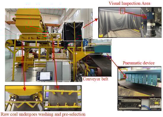 The dynamic coal gangue sorting experiments in this study were conducted on a laboratory-scale intelligent sorting platform, as shown in Figure 6, with a conveyor belt speed of 0.6 m/s. At the current stage, the proposed detection algorithm has not yet been deployed on an actual production conveyor in a coal preparation plant. This experimental setting was primarily adopted to enable controlled evaluation of the detection accuracy, sorting effectiveness, and system stability. Large-scale field testing under full industrial operating conditions is planned as future work.