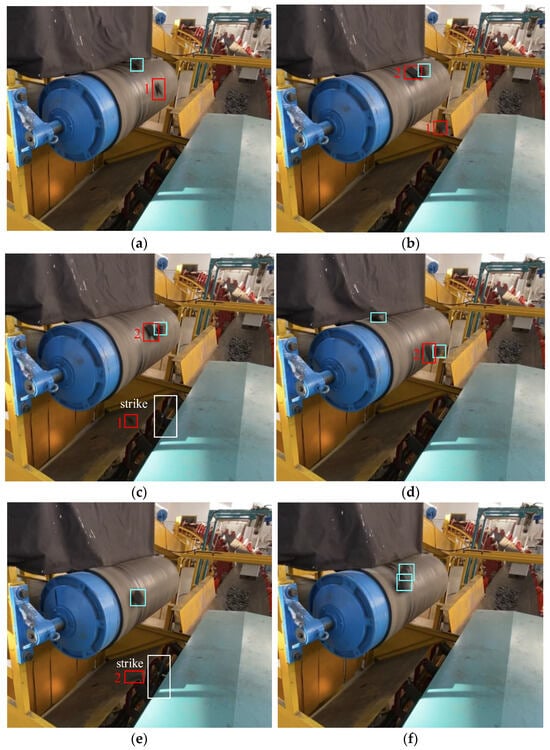 Dynamic process of sorting (a) coal gangue and coal falling process-1; (b) coal gangue enters the cylinder impact zone; (c) cylinder impacting coal gangue-1; (d) coal gangue and coal falling process-2; (e) cylinder impacting coal gangue-2; (f) waiting for the coal gangue to fall.