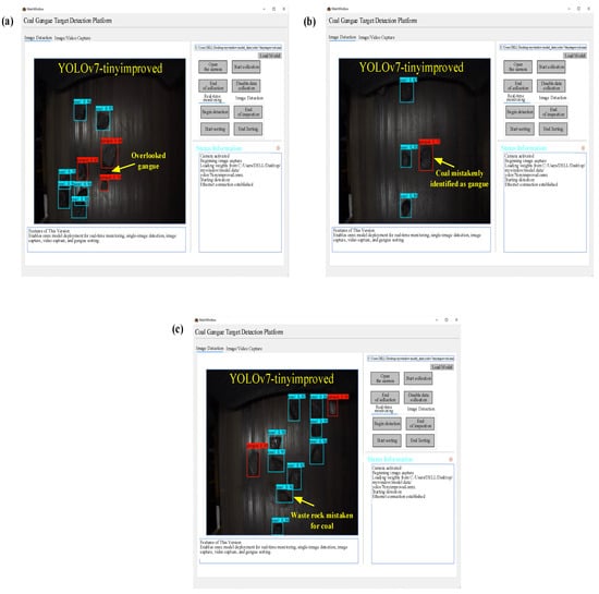 In coal gangue sorting experiments, experimental data showed that when using YOLOv7-tinyimproved as the detection model, the gangue sorting accuracy reached 82.2%, with a coal misclassification rate of 8.1%. However, the model still exhibited some missed detections and misclassifications during actual sorting operations, as illustrated in Figure 8. These primarily manifested in three types: failure to identify gangue, misclassifying gangue as coal, and misclassifying coal as gangue. Despite these recognition errors, the sorting system built upon this improved model demonstrated reliable performance, providing crucial reference data for subsequent model optimization and system enhancement.