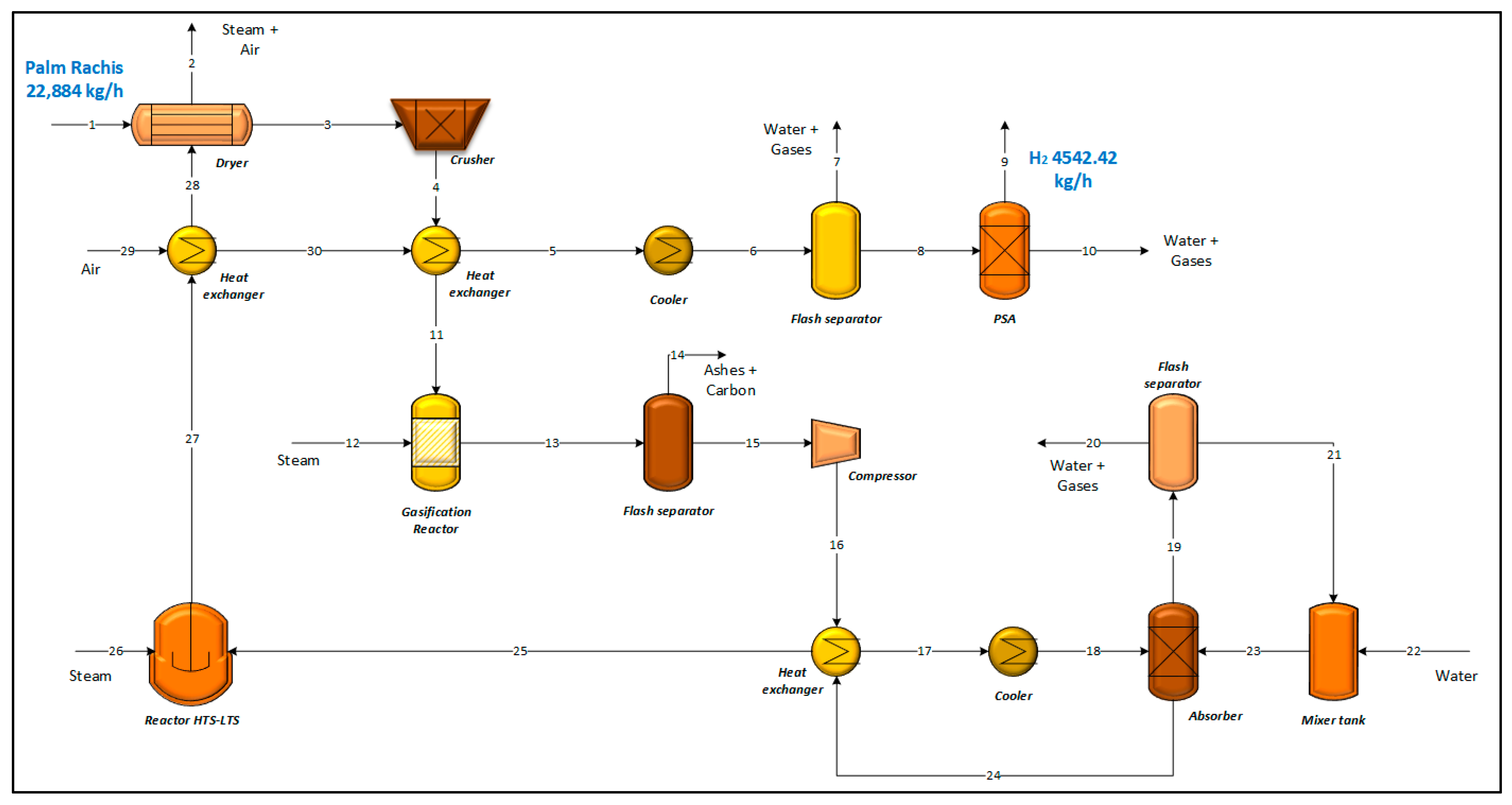 The gas stream is sent to a separator, producing two streams: a residue stream composed of water with traces of carbon, and a product stream, which is directed to a compressor to increase its pressure. The compressed stream is then passed through a series of heat exchangers to reduce its temperature before entering the absorption tower. In this equipment, the stream, mainly containing sulfur oxide, carbon monoxide, and methane, is washed. Water is supplied during the washing stage to capture condensable gases, while the non-condensable gases are sent to the high temperature (HTS) and low temperature (LTS) reactors. In the reactors, the incoming gas stream contacts steam. In the HTS (first reaction stage), the carbon monoxide-rich gas reacts with steam to promote the conversion of CO into CO2 and H2, while the LTS reactor completes the conversion of the remaining CO [21,22]. The gas exiting the reaction stage is heated before entering a second separator, which generates two streams: one consisting of a mixture of water, carbon dioxide, and sulfur dioxide, and the other directed to the PSA unit to purify hydrogen by separating it from CH4, CO, CO2, and other components. The plant in María la Baja processes 183,072 t/year of palm rachis to produce 36,339 t/year of hydrogen. Figure 1 shows the process flow diagram.