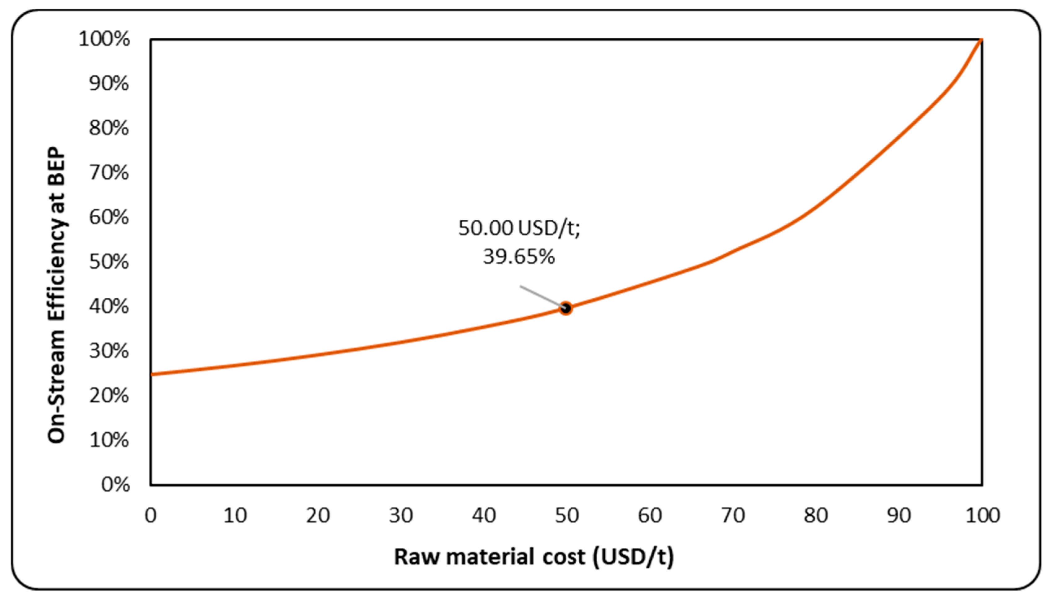 The normalized variable operating costs of the plant are USD 532.51/t; therefore, the identified critical point is relatively distant from this value, allowing an ROI of 58.83% to be achieved. Consequently, it is evident that an increase in NVAOC leads to a decrease in ROI, making the determination of this relationship essential for analyzing process profitability and supporting decision-making aimed at maximizing revenues.