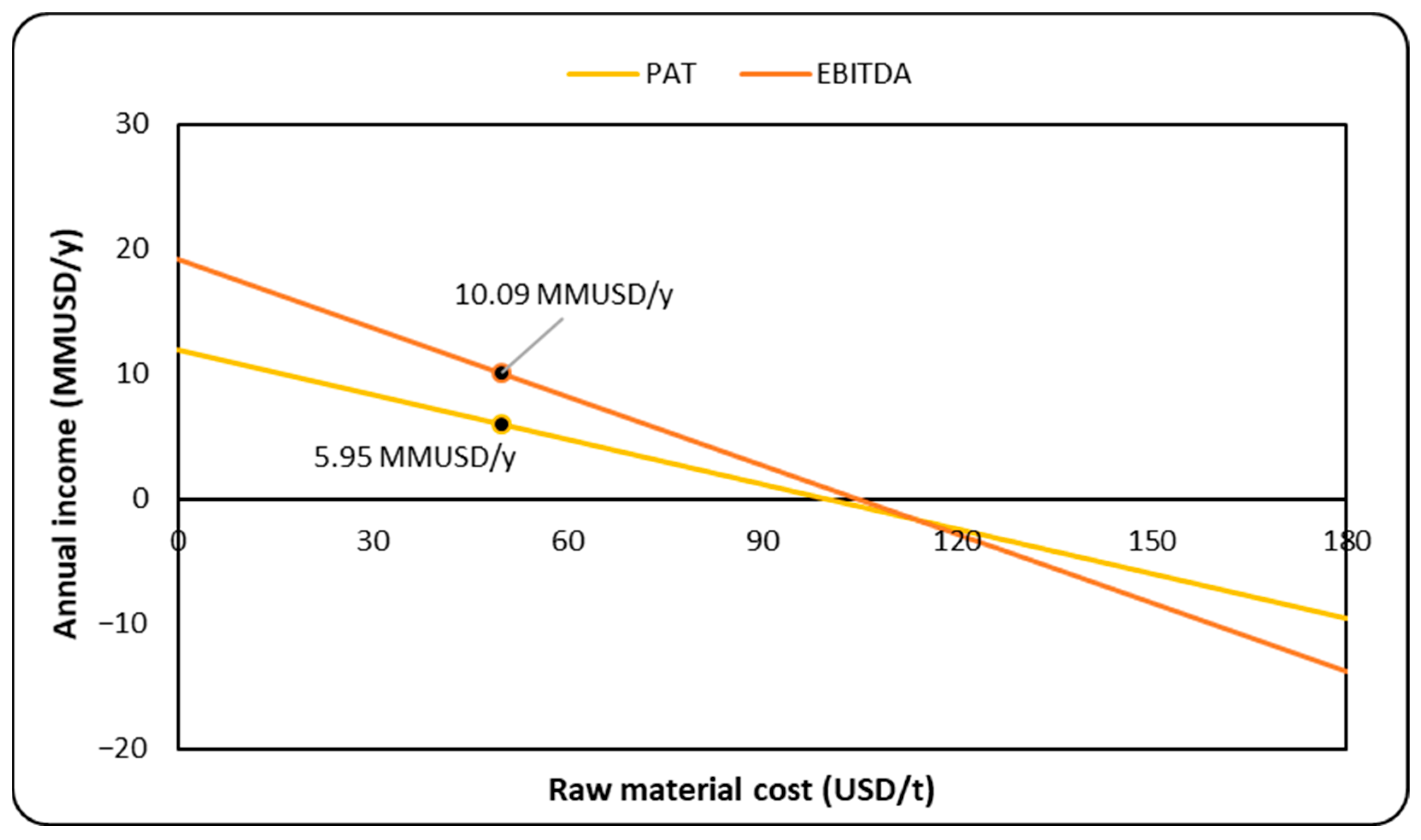 Figure 3 shows the feedstock cost at the break-even point, which is located at approximately 120 USD/t. Above this value, the process begins to incur losses, as negative values are obtained for the Profit After Taxes (PAT), EBITDA, and annual income indicators. In contrast, feedstock costs below the critical point represent profitable scenarios for the hydrogen production process from palm rachis.