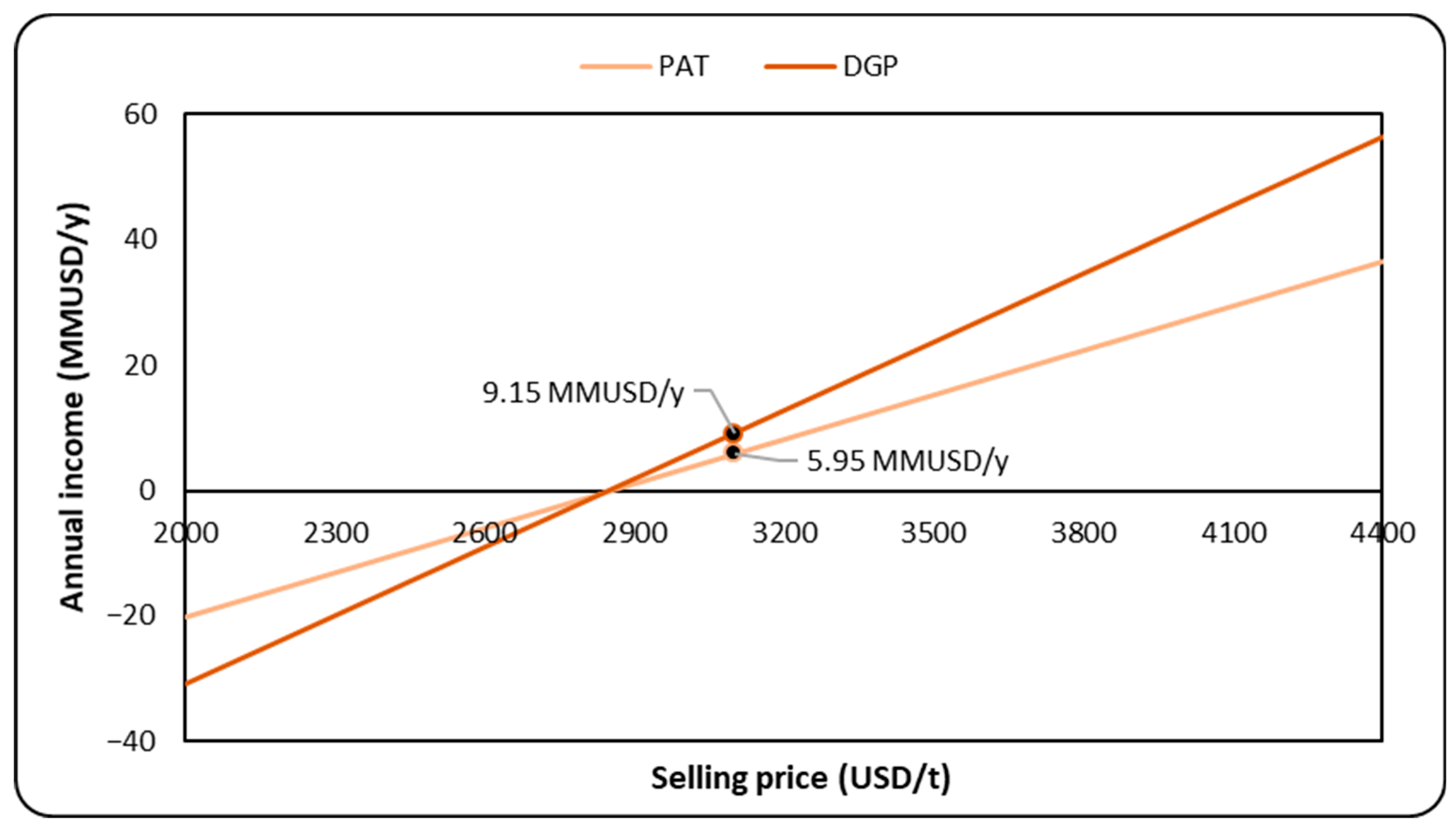 The assumed selling price of 3100 USD/t was adopted as the baseline value for the techno-economic assessment and does not correspond to a fixed contractual price. This value was selected as a reference scenario based on publicly available catalog and literature data, given the absence of a mature local market under Colombian conditions. To address the uncertainty associated with this parameter, a resilience analysis was conducted by evaluating selling price variations above and below the baseline, allowing the identification of profitability thresholds and assessing their impact on the main economic indicators [34,35].