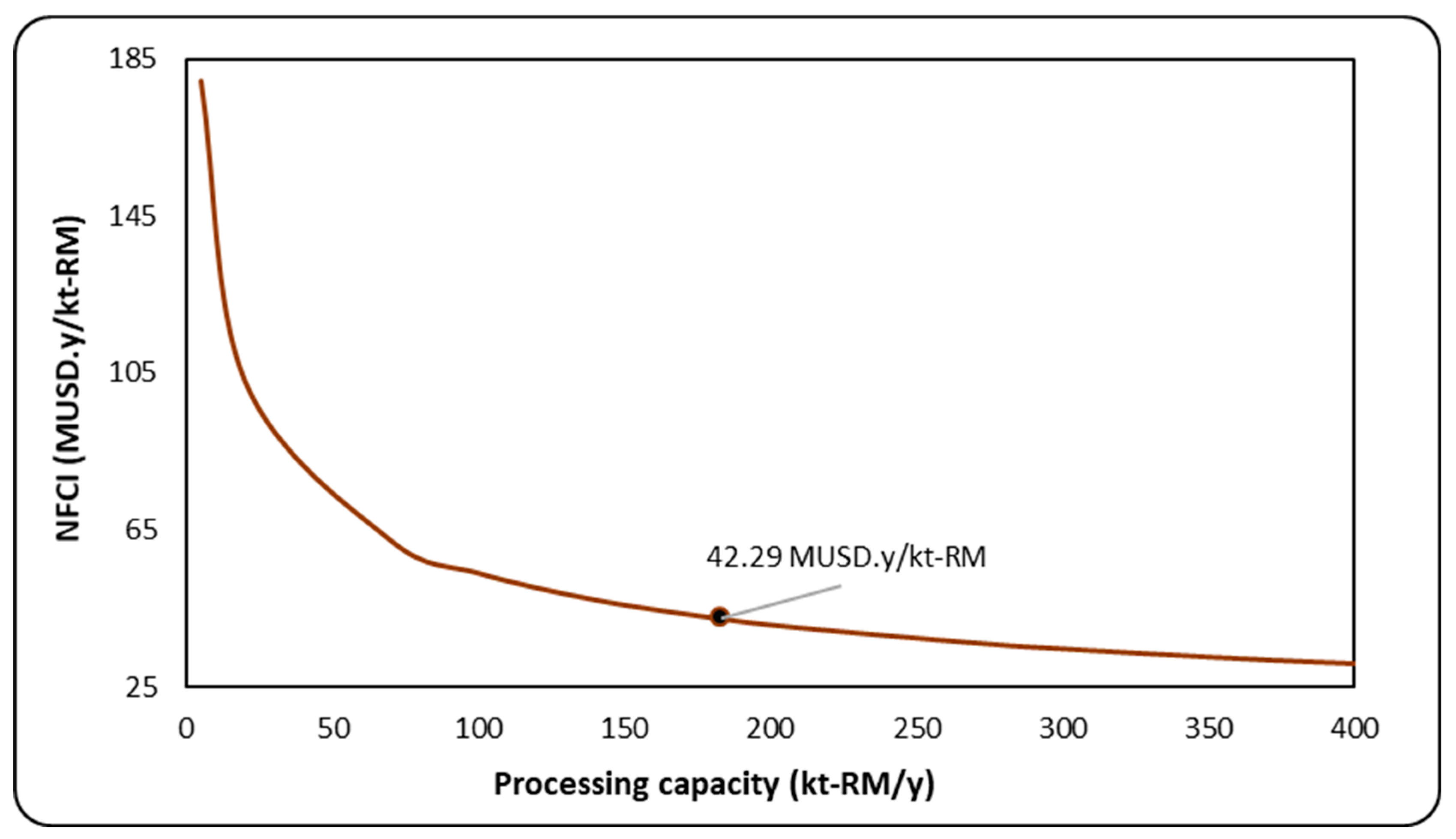 Figure 8 shows the relationship between normalized fixed costs and processing capacity in a hydrogen production plant based on palm rachis gasification. The process was assumed to have an installed capacity of 183,072 tons per year, with a normalized fixed capital investment (NFCI) of USD 42.49 thousand per year per kiloton of feedstock. Fixed costs remain constant regardless of the volume of product obtained. The figure reveals an inversely proportional relationship, as an increase in installed capacity leads to a decrease in NFCI.
