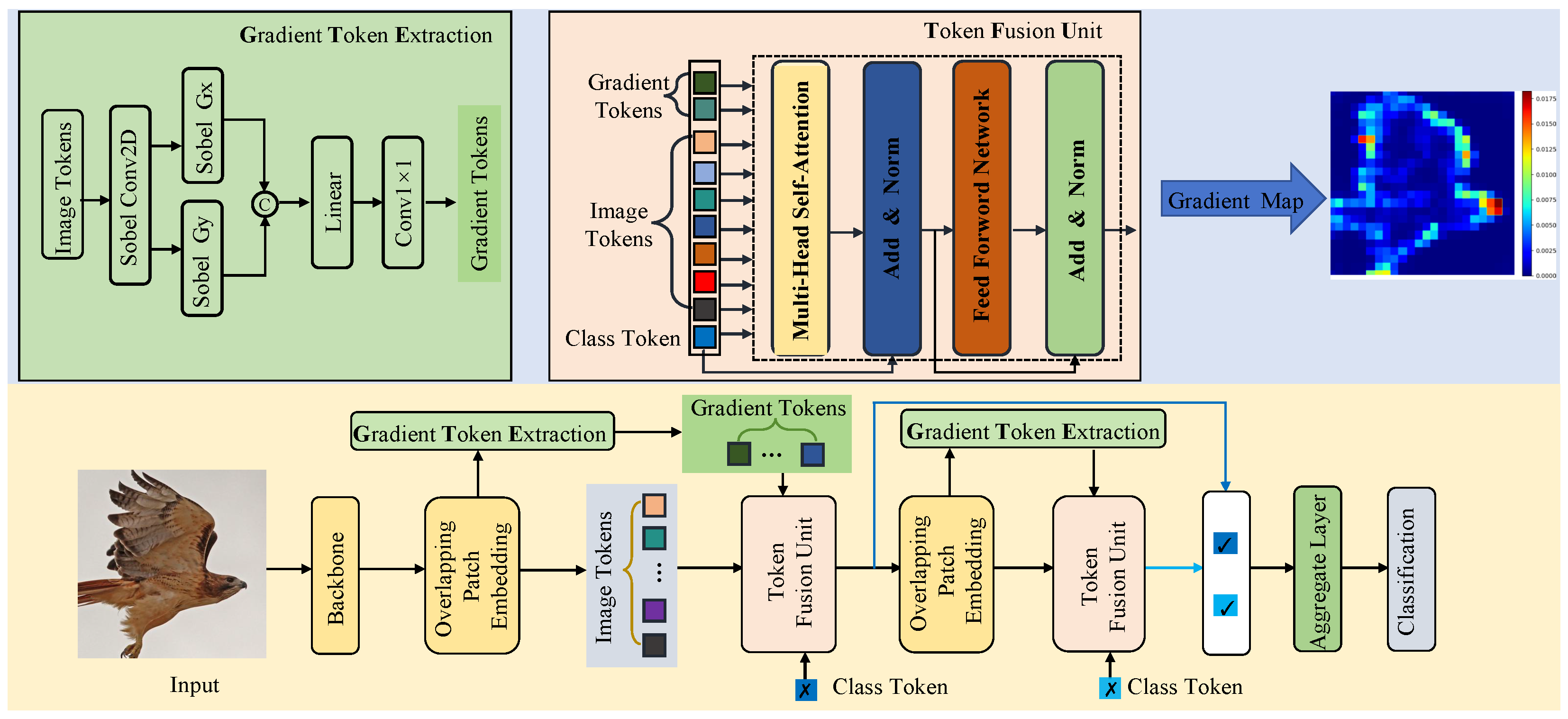 The overall architecture of the proposed Gradient-Aware Token Injection Transformer is illustrated in Figure 2. Given an input image, a convolutional backbone is first employed to extract dense feature maps, which are then converted into a sequence of image tokens through overlapping patch embedding to preserve local spatial continuity. However, standard tokenization schemes mainly encode appearance statistics and tend to suppress first-order spatial variations during successive feature aggregation. To explicitly preserve fine-grained gradient cues—such as edge contours and subtle texture transitions—that are critical for fine-grained recognition, we introduce a Gradient Token Extraction (GTE) module.