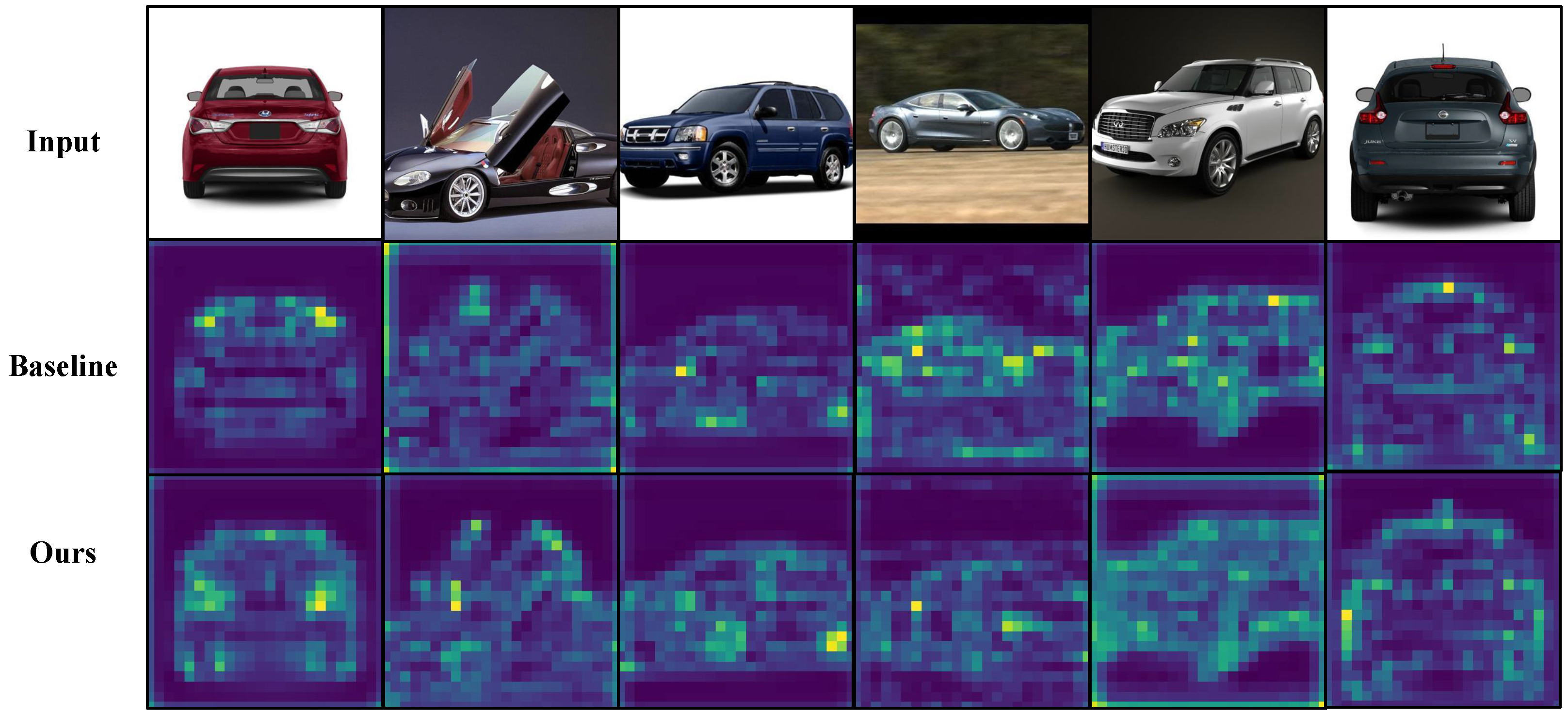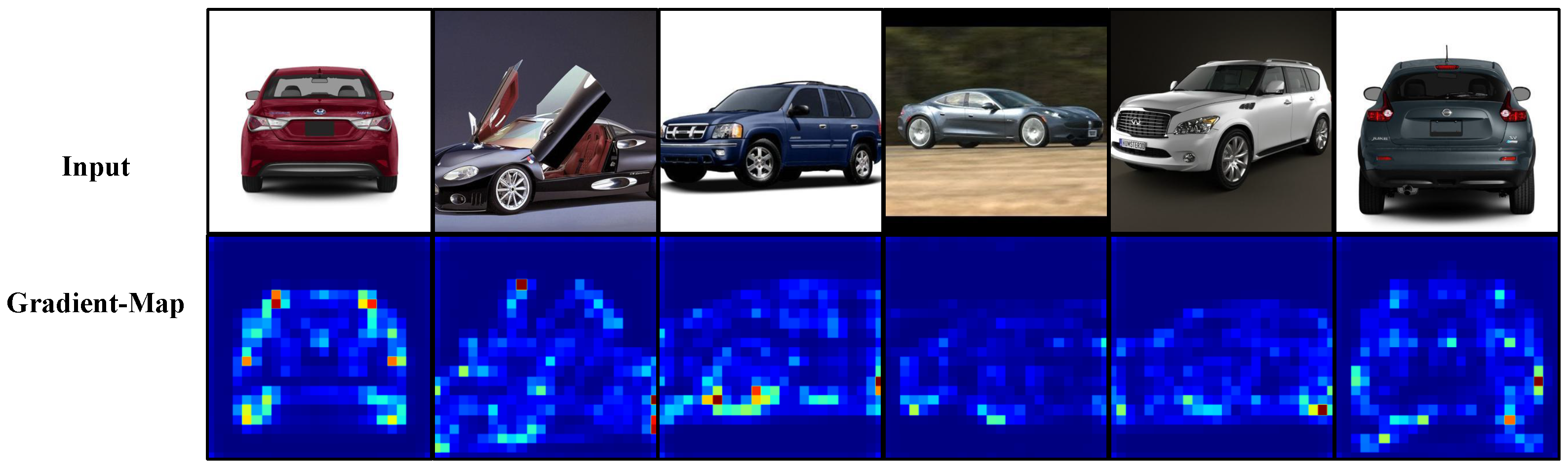 Self-Attention Aggregation Step: The self-attention mechanism fuses token features based on similarity scores, prioritizing global semantic consistency over local spatial gradient preservation. For stacked attention layers, this global fusion further smooths the spatial gradient information embedded in tokens: as tokens are repeatedly aggregated across layers, the distinct gradient cues that distinguish adjacent regions (e.g., between a headlight and the car body) are progressively diluted, resulting in attenuation of image content feature gradients.