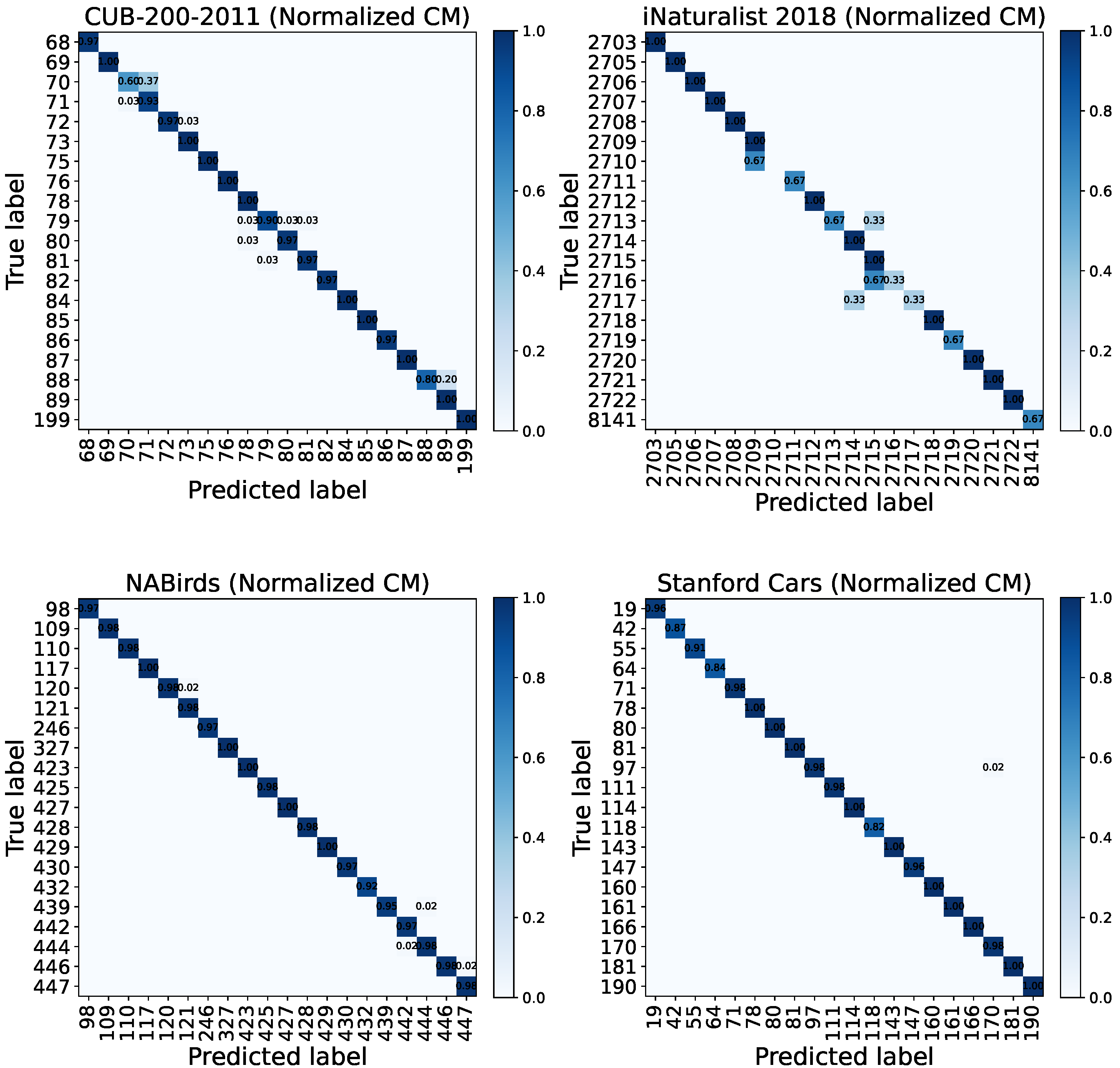 Table 8. Performance of the model on fine-grained datasets in terms of top-1/top-5 accuracy, F1-scores, and macro AUC. All values are rounded to two decimal places.