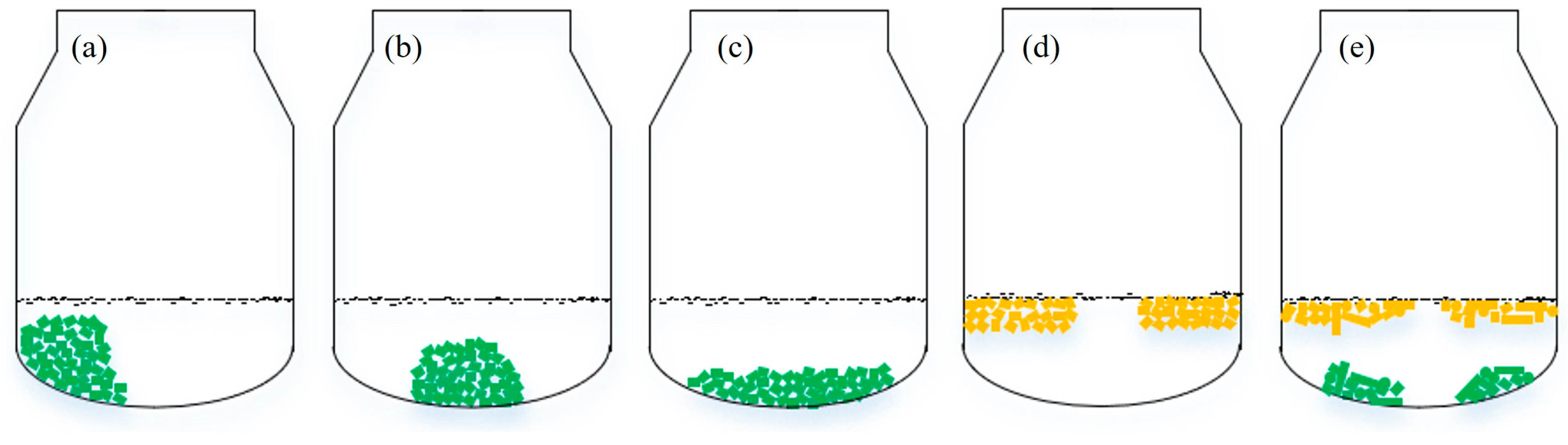 The various states of scrap steel within the converter: (a) inclined, (b) concentrated, (c) uniform, (d) hovering, (e) hovering and settling.