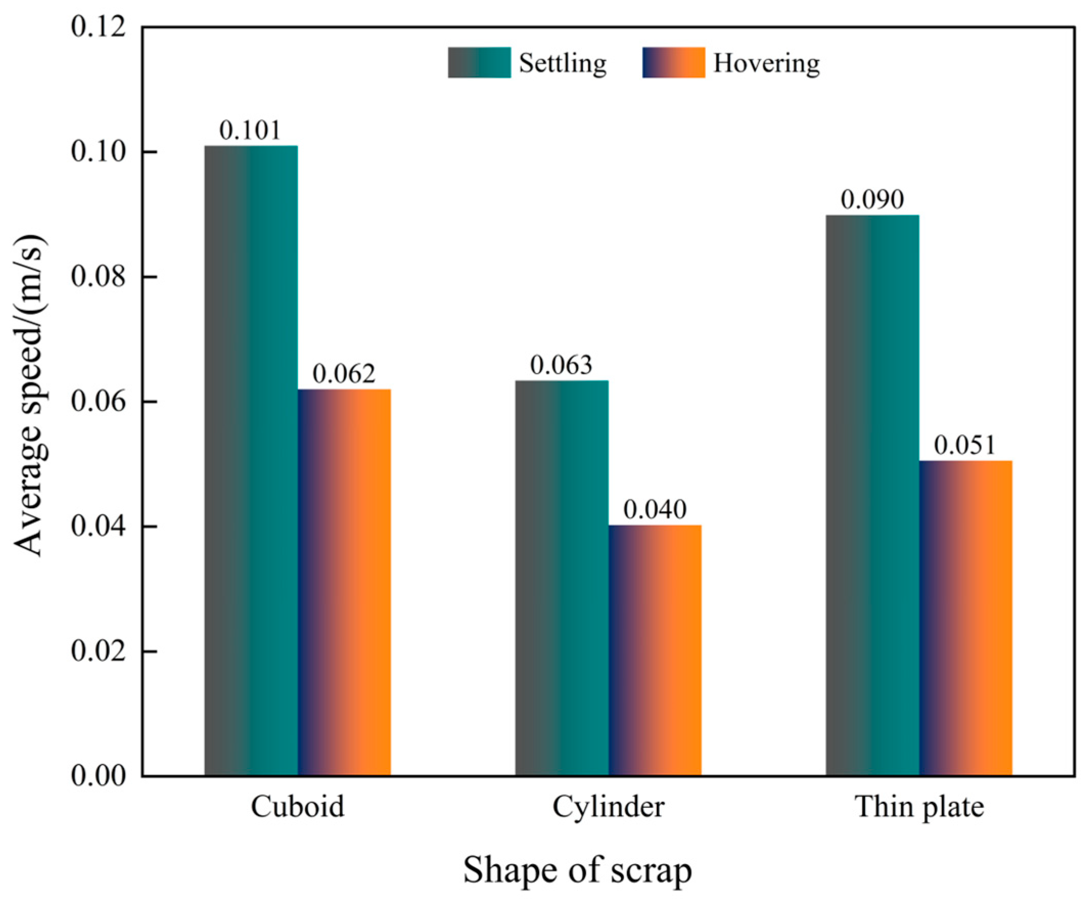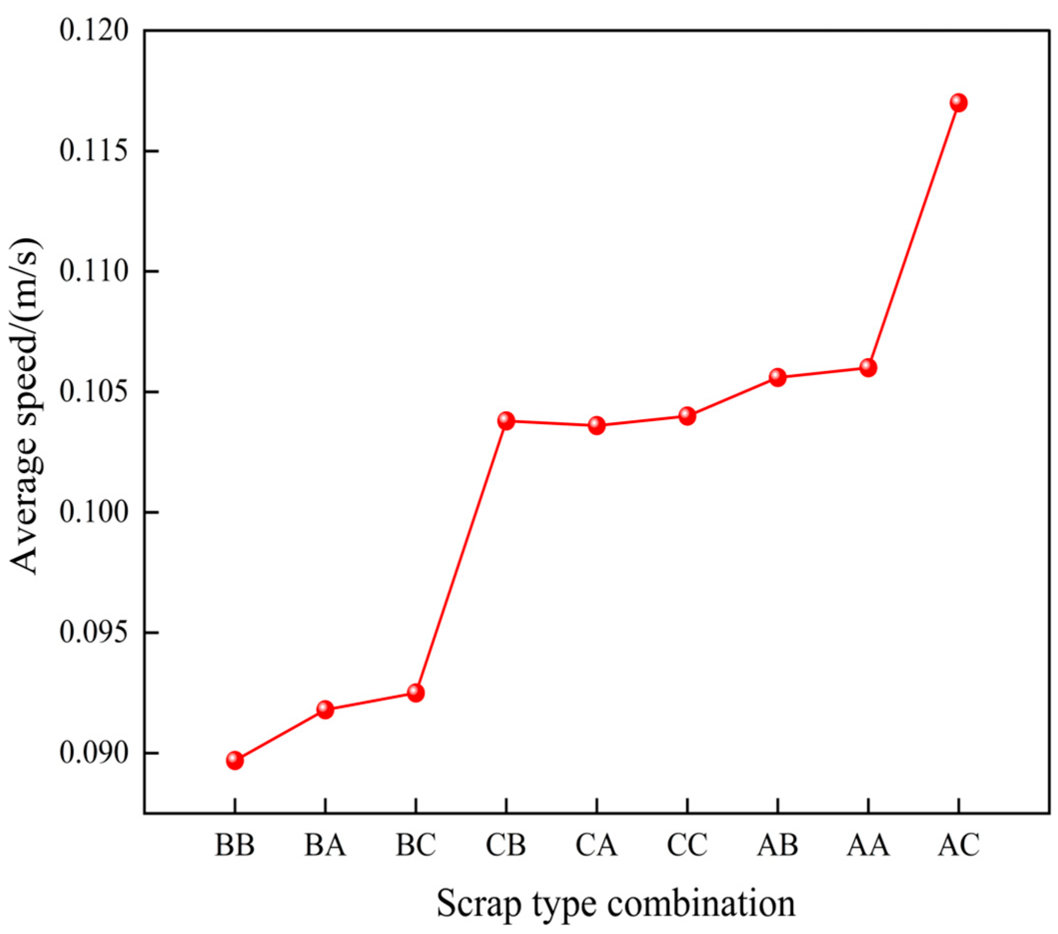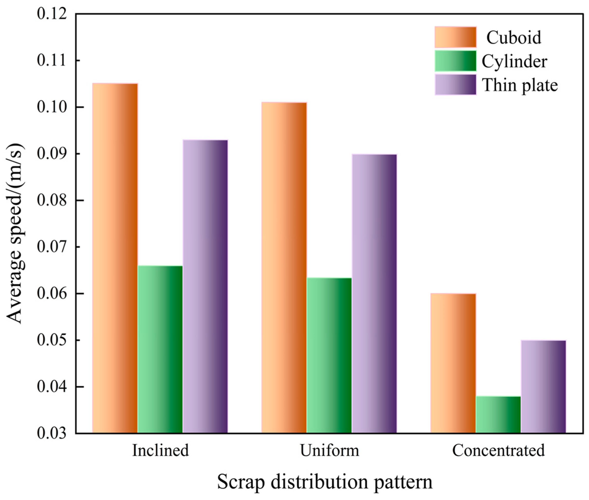 The average velocity of the melt pool for different scrap steel distribution patterns.