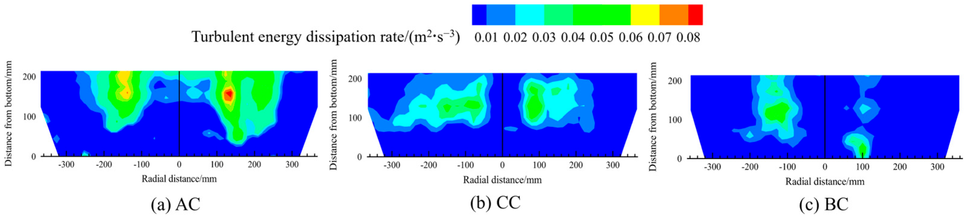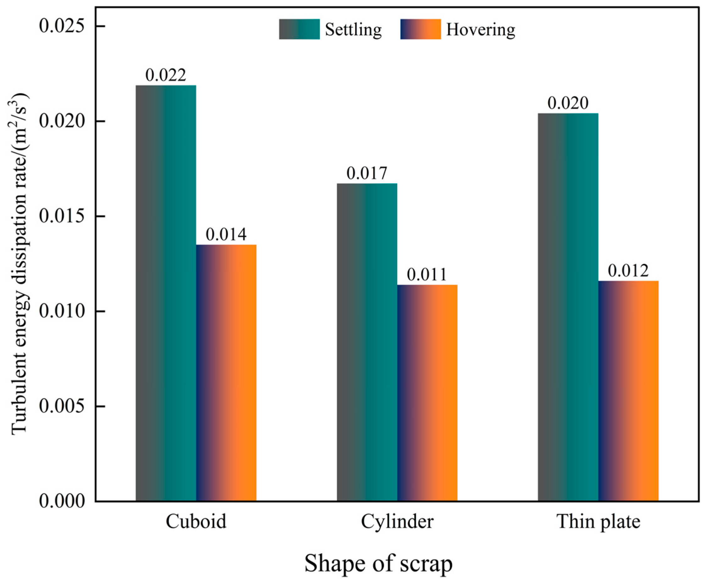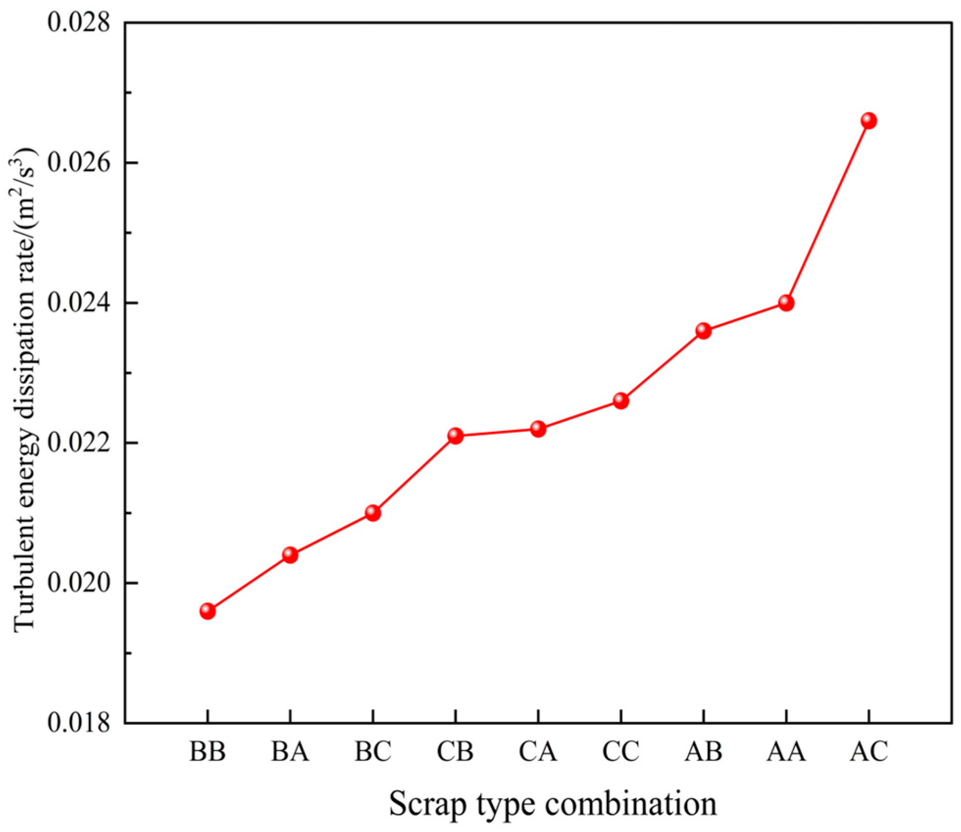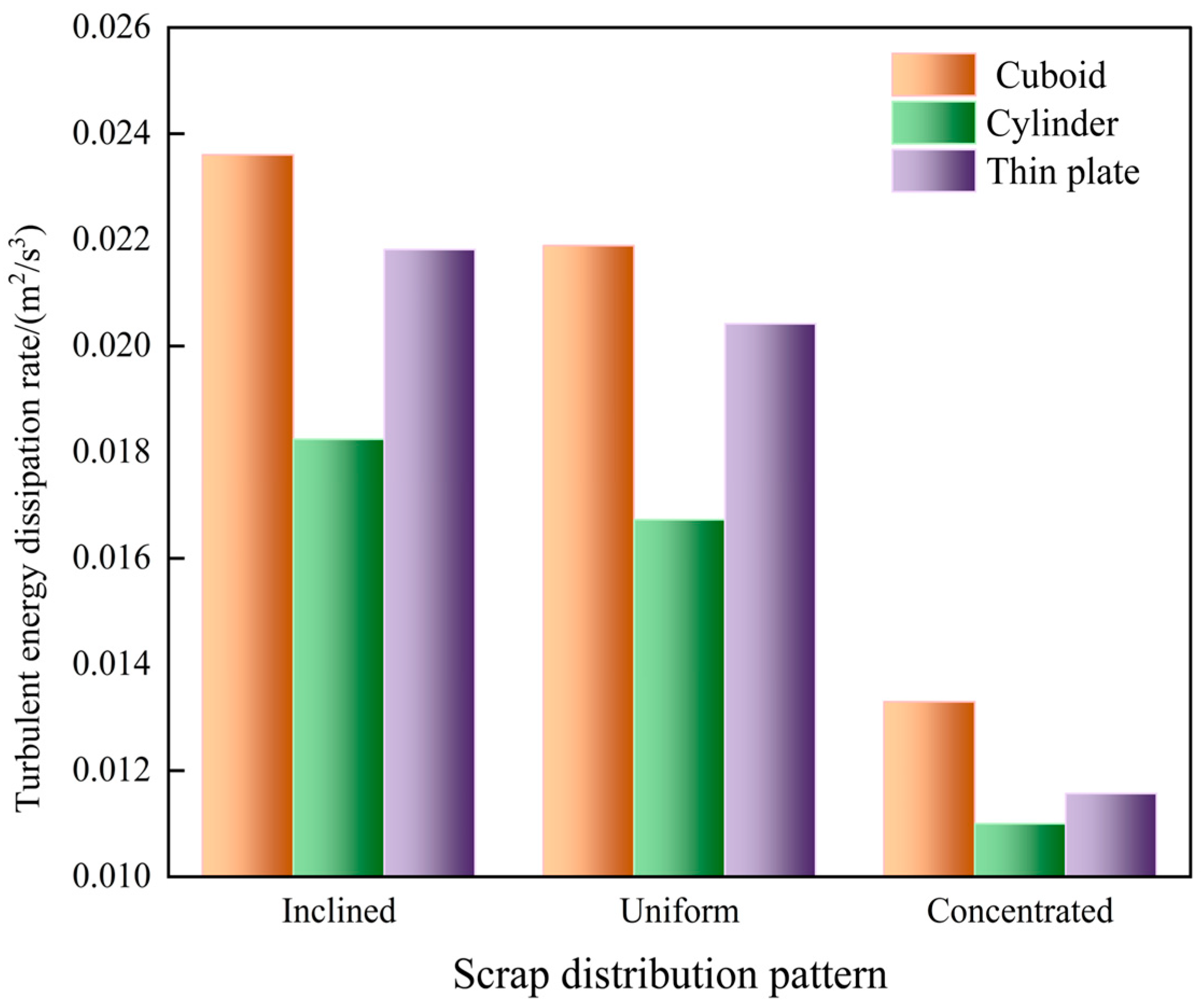 The average turbulent energy dissipation rates of the melt pool for different scrap steel distribution patterns.