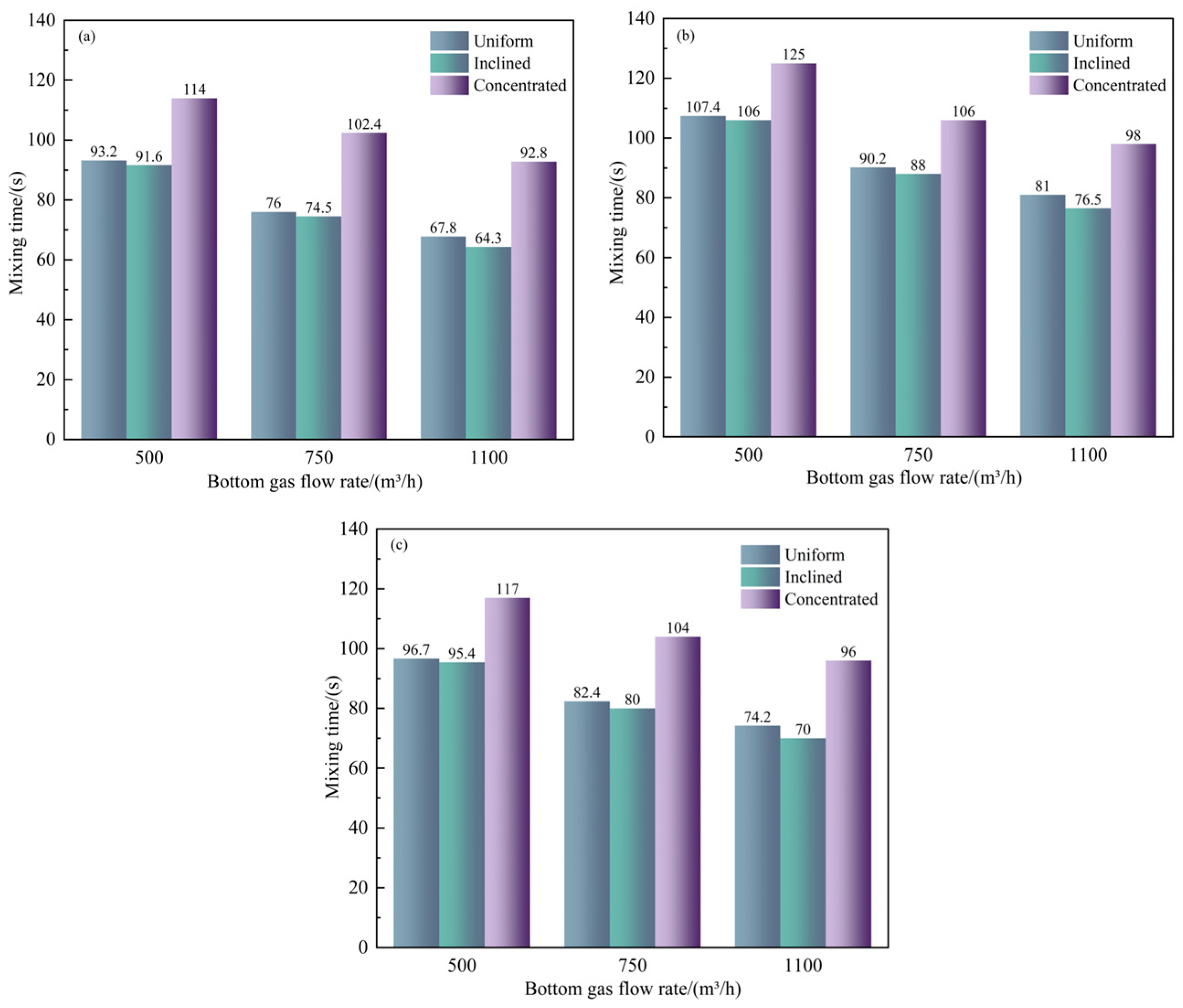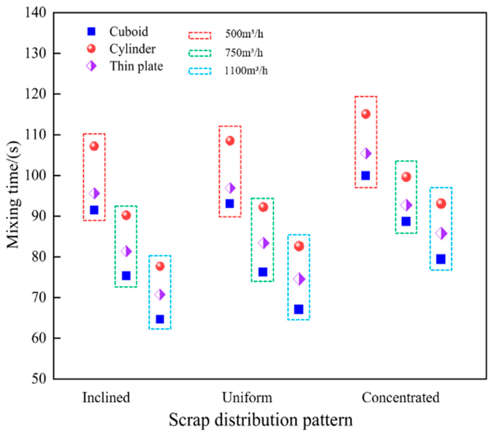 The relationship between melt pool mixing time and the scrap steel distribution pattern: (a) cuboid; (b) cylinder; (c) thin plate.
