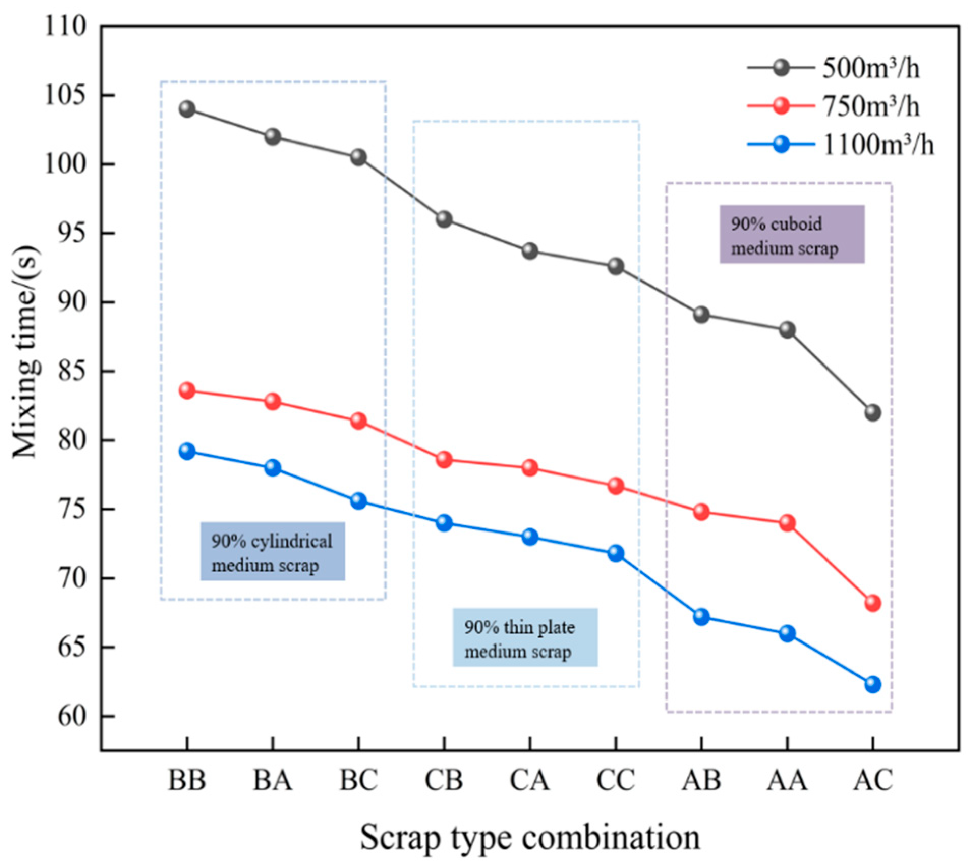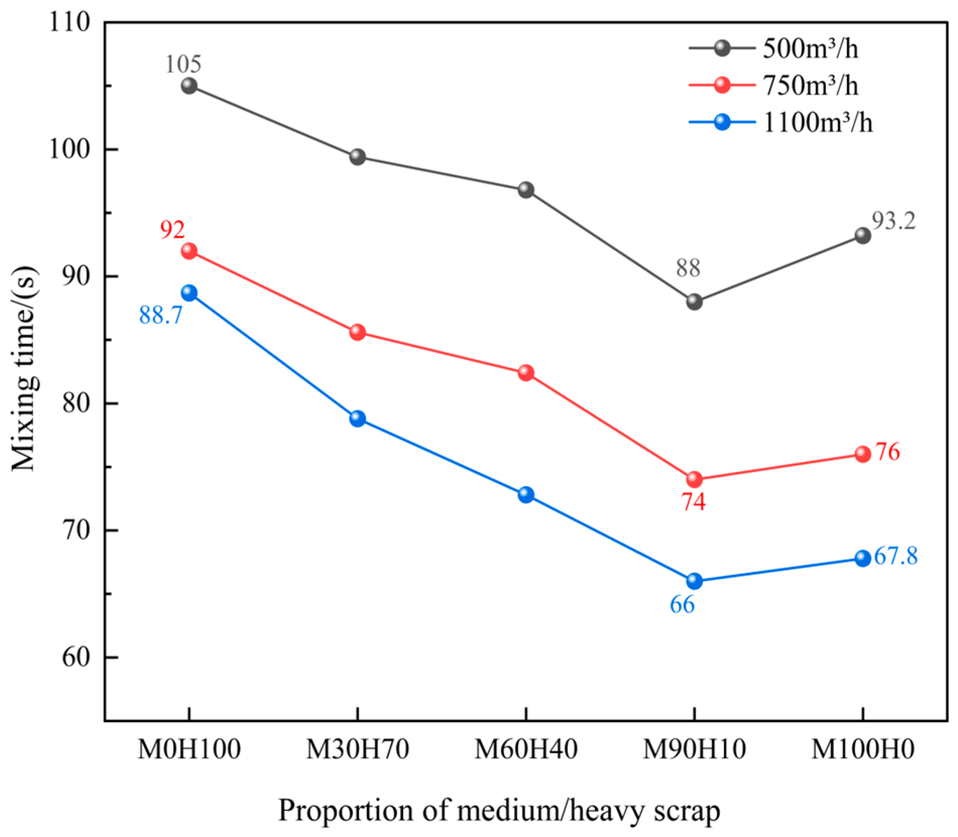 The decrease in mixing time based on the proportion of medium and heavy scrap steel.