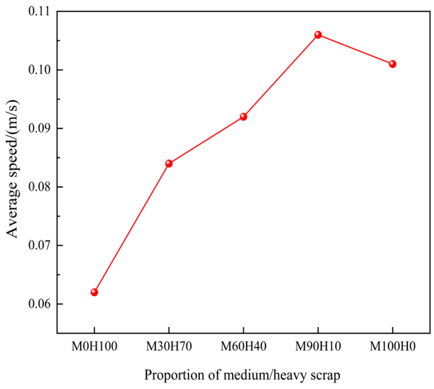 The average velocity of the melt pool for different medium-to-heavy scrap ratios.