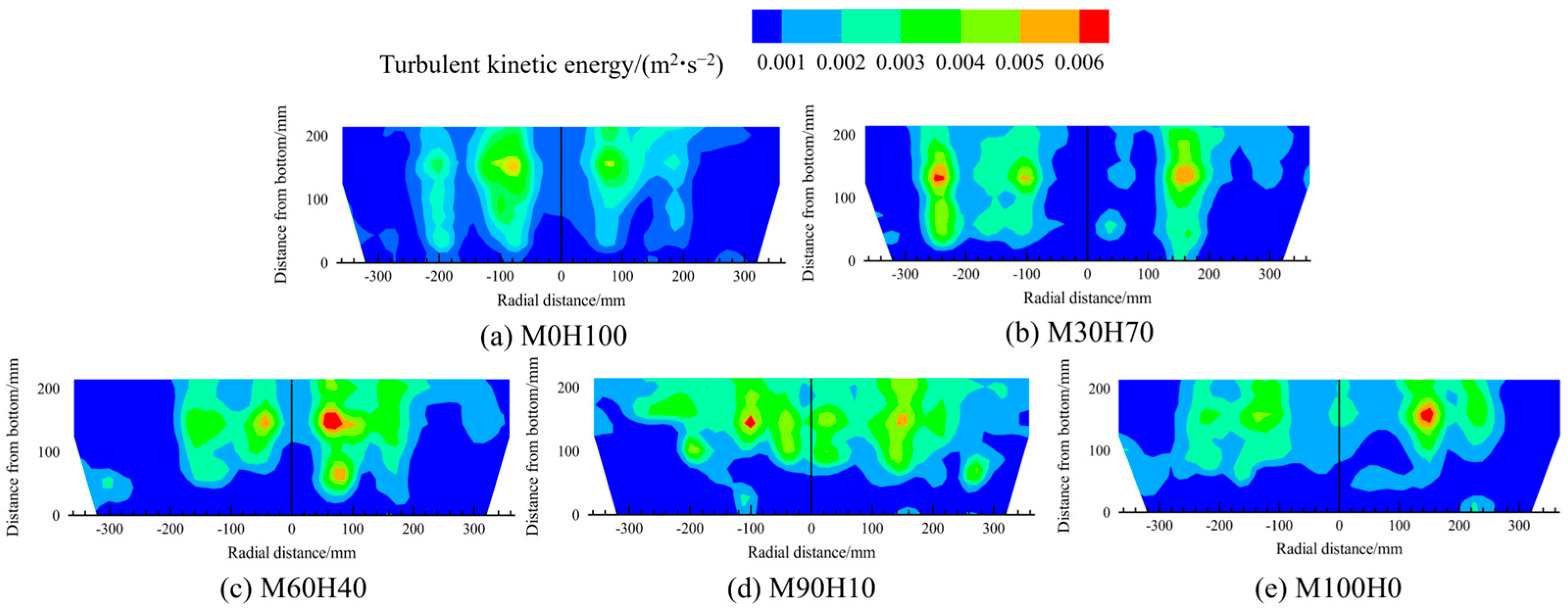 The contour maps of the distribution of the turbulent kinetic energy in the melt pool for different medium-to-heavy scrap ratios.