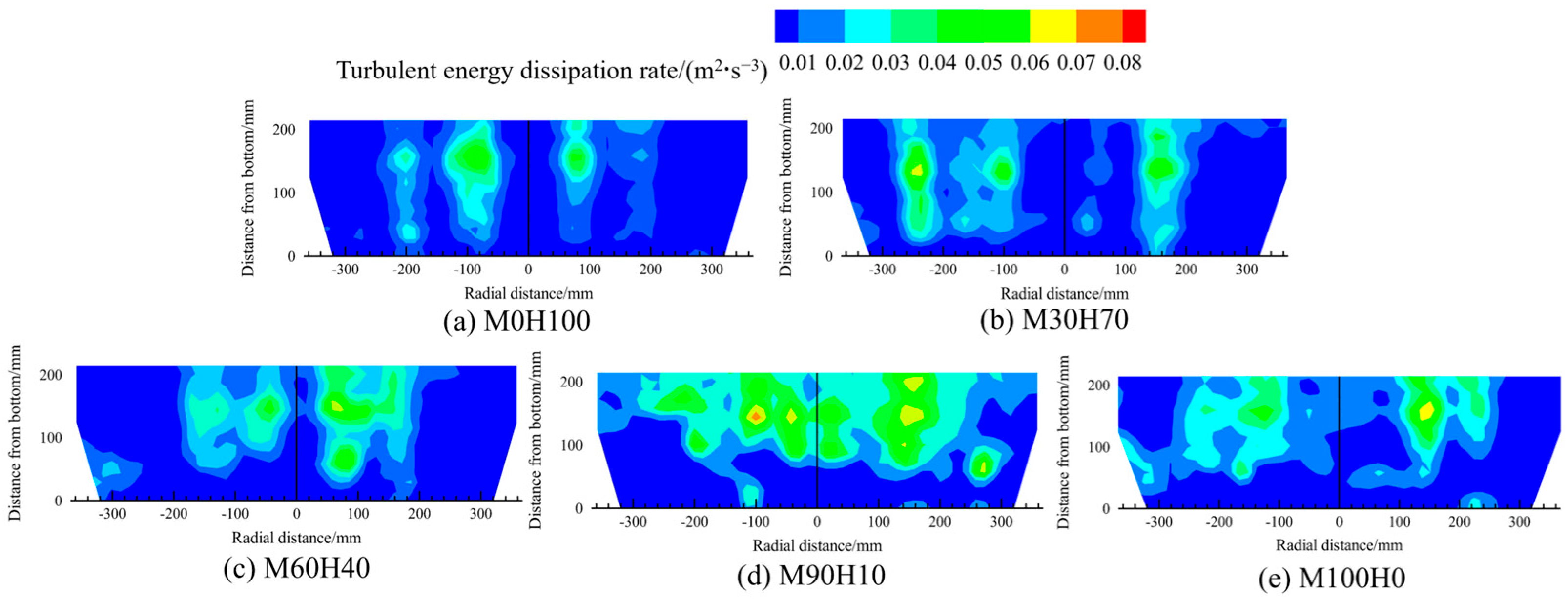 The contour maps of the distribution of the turbulent energy dissipation rate in the melt pool for different medium-to-heavy scrap ratios.