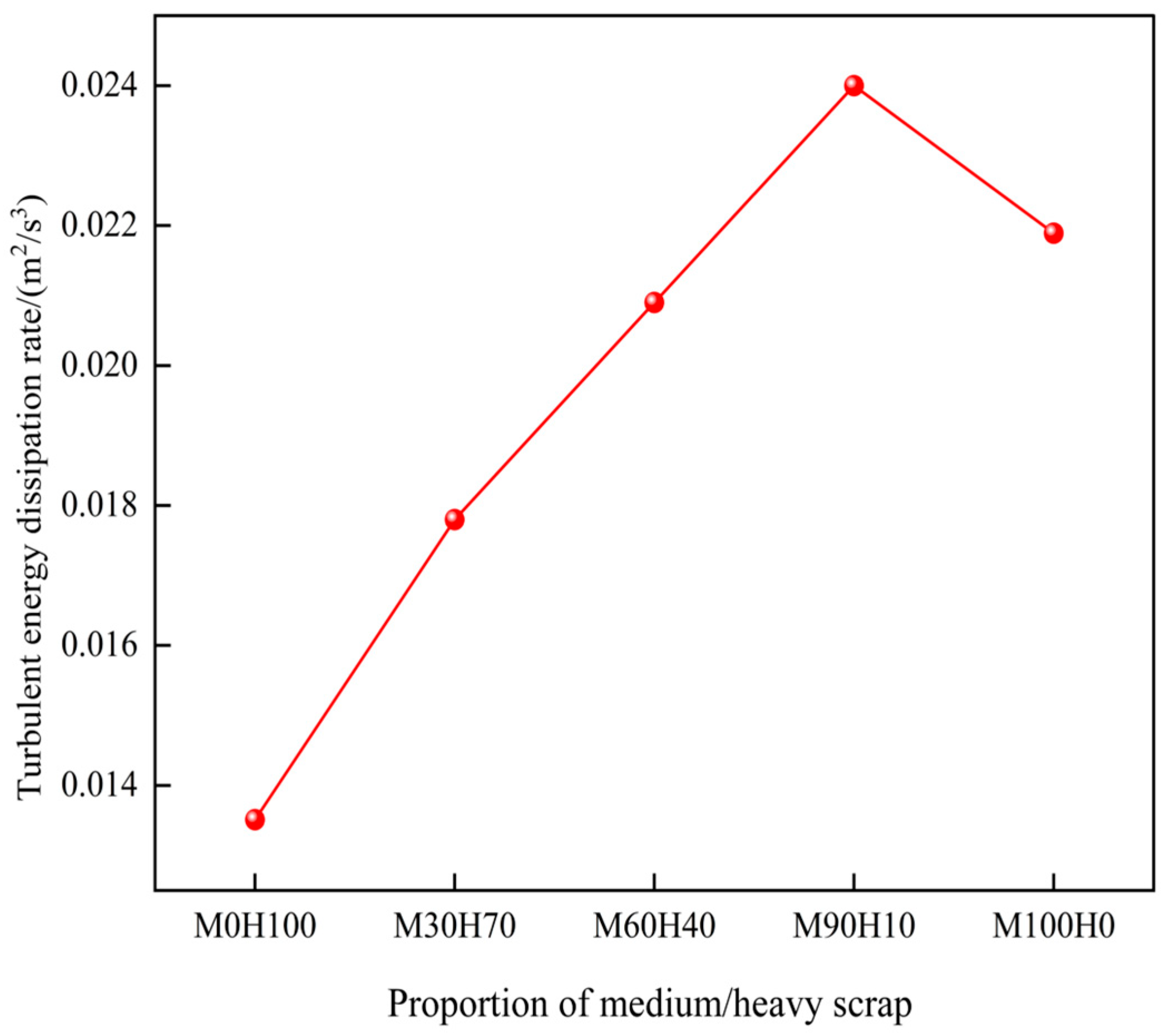The average turbulent energy dissipation rate of the melt pool for different medium-to-heavy scrap ratios.
