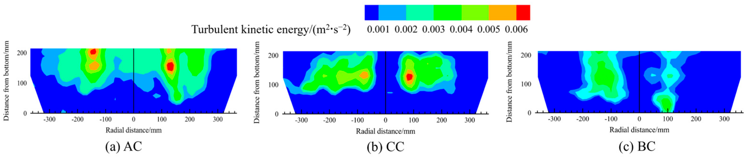 The contour maps of the distribution of the turbulent kinetic energy in the melt pool for different scrap steel distribution patterns.