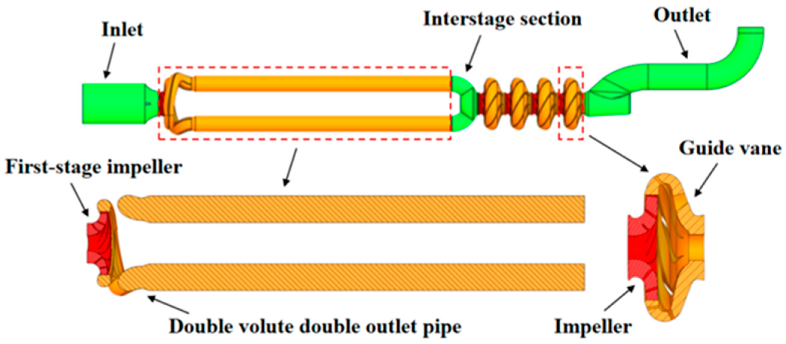 Figure 1) comprises an inlet bell, first-stage impeller, volute, intermediate conduit, second-to-fifth-stage impellers, spatial guide vanes, and an outlet pipe. Structurally, the first-stage impeller is paired with a double-volute casing. The flow subsequently passes through a long dual-passage conduit before entering the second-stage impeller. Stages two through five are equipped with spatially arranged guide vanes connected in series. This configuration contributes to reduced system vibration and enhanced operational stability.