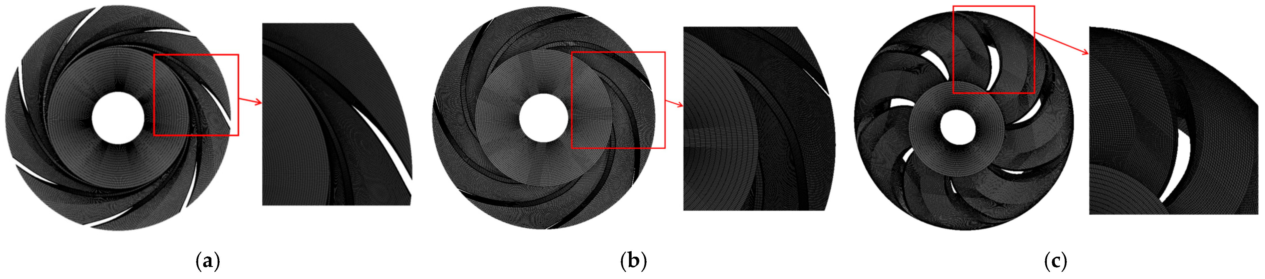 To ensure both accuracy and computational efficiency, the quality and size of the fluid domain mesh were determined according to the model geometry and boundary conditions. The rotating components were discretized with hexahedral structured grids using ANSYS ICEM CFD 2022 R1, while the stationary parts were meshed with tetrahedral unstructured grids.